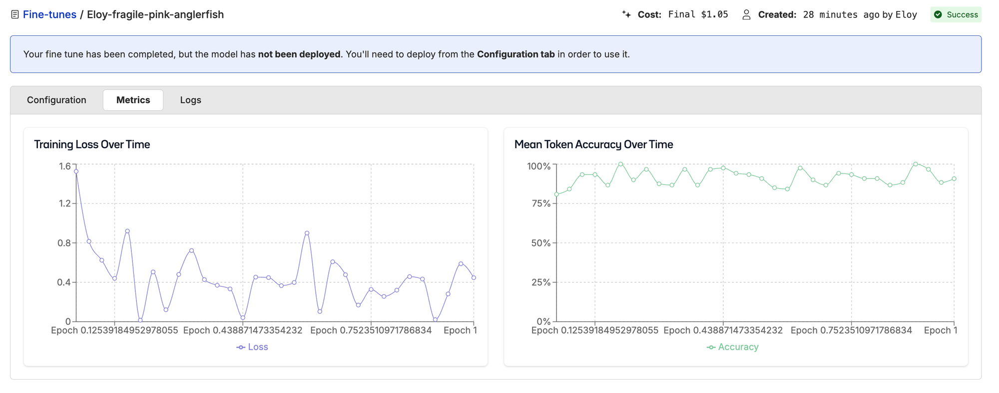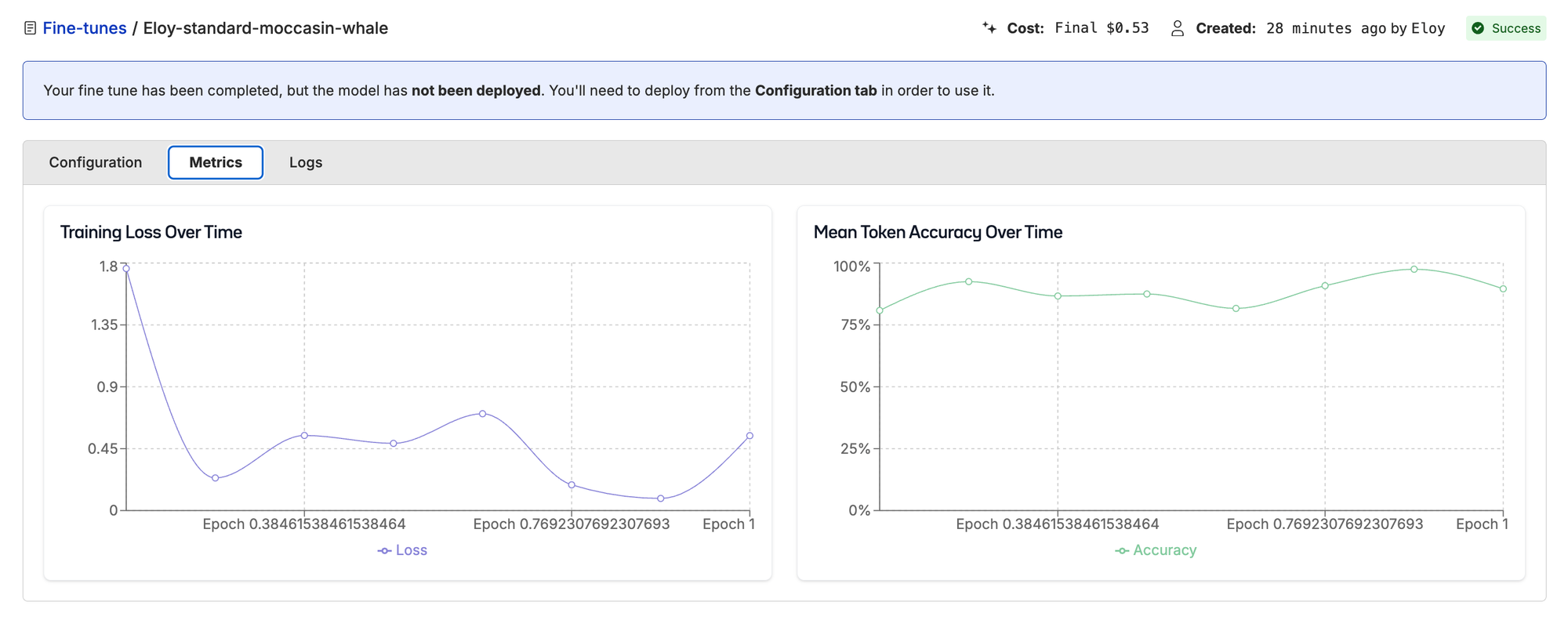 All we have to do to run these fine-tunes on Oxen is upload your dataset (1–2 clicks), start a new fine-tune, choose which columns of your dataset you want to train on (4–5 clicks), and just wait for the magic! The full 319 sample training run took about 8 minutes and cost just $1!