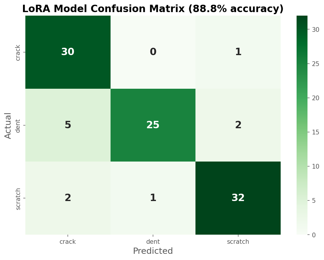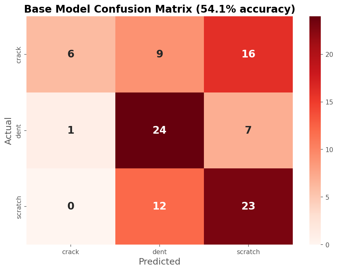 This is a pretty interesting challenge for a few reasons. Labeling this type of damage is tough even for humans, the visual differences between a crack and a scratch are subtle, and a dent with scraped paint can easily be mistaken for either.