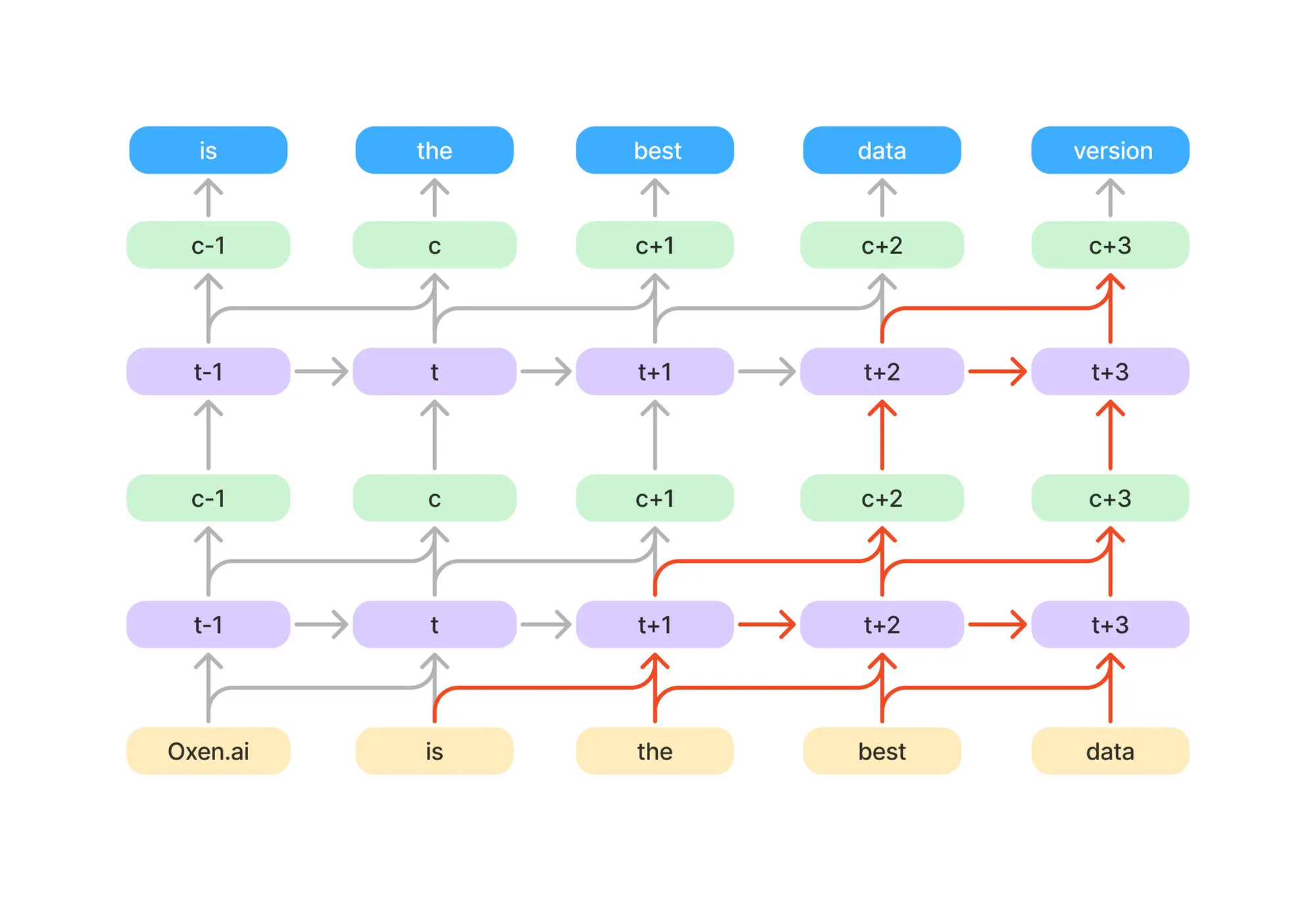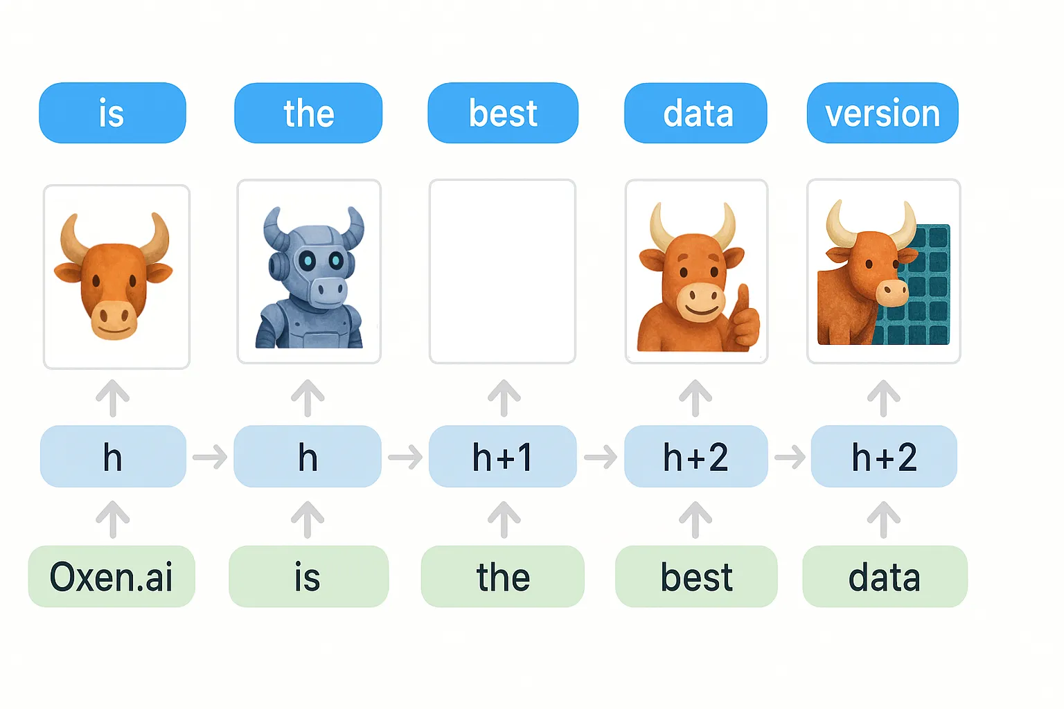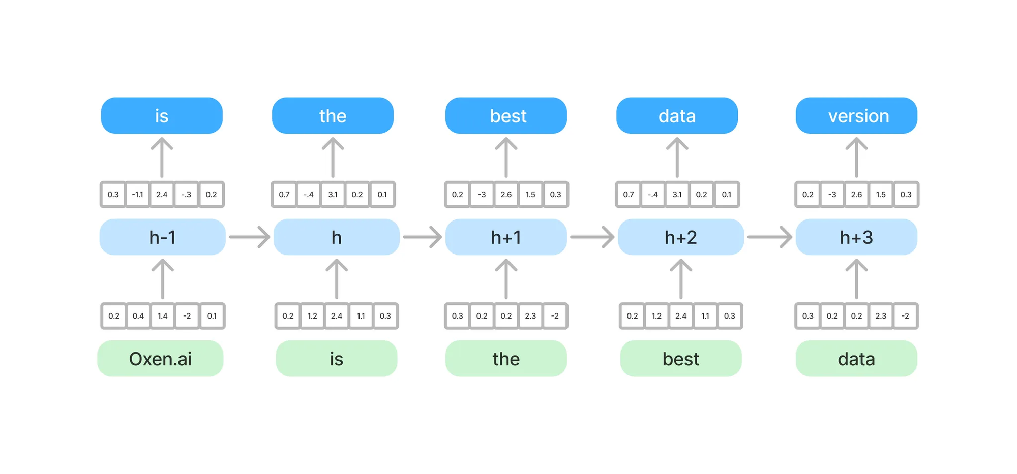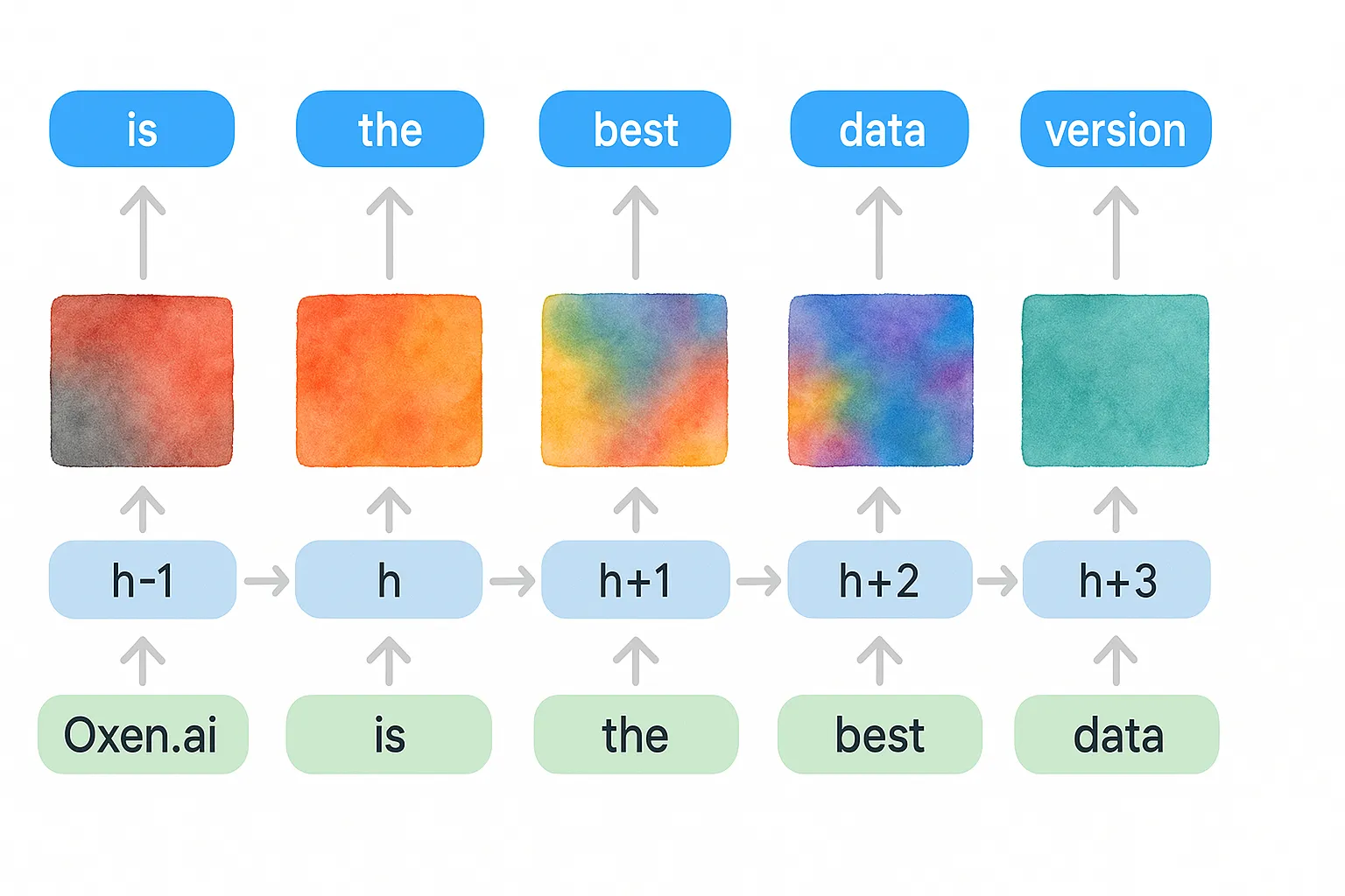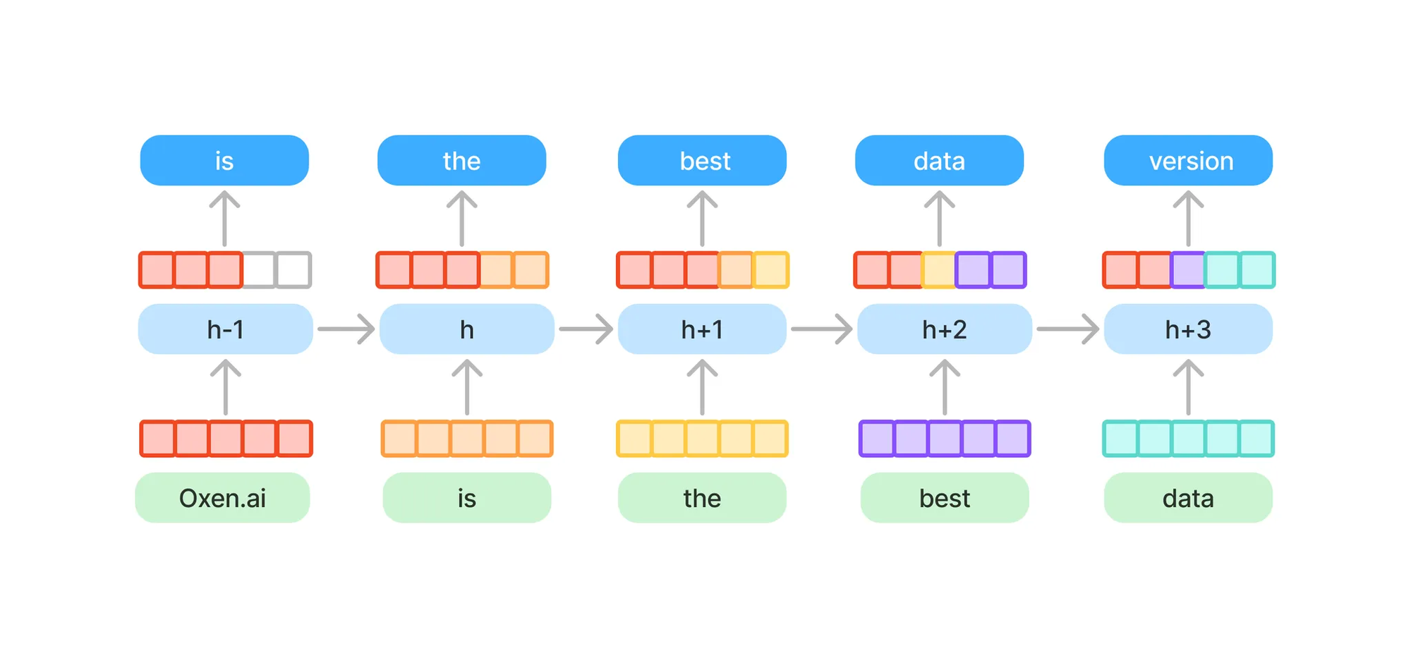 Imagine each input word as a single color representing that word. Oxen.ai is red, best is purple, data is cyan, etc. Each time step you have to update the hidden state with some information from that word, represented by the color.