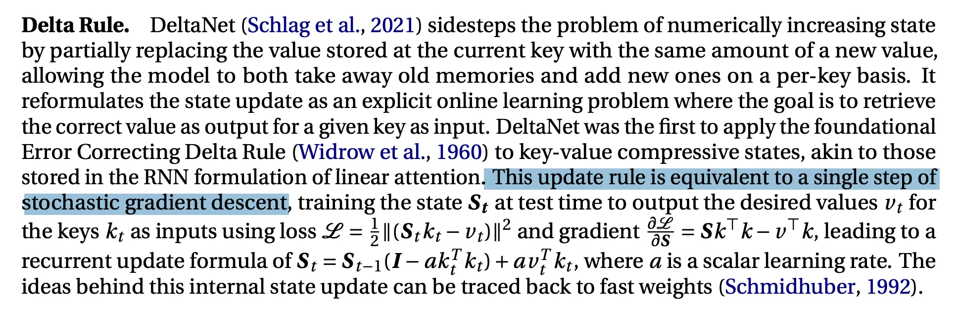 To understand what any of the jargon in the paper means, we have to understand the intuition behind DeltaNet and how these models âlearn at test timeâ. The idea is using gradient descent during inference to update the hidden state.