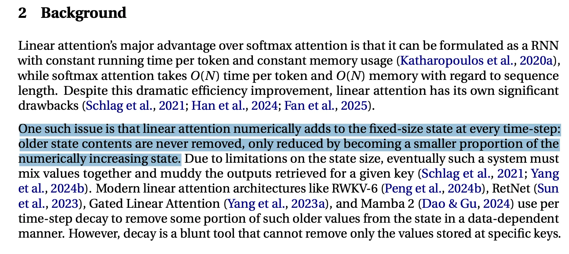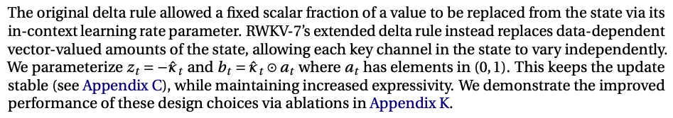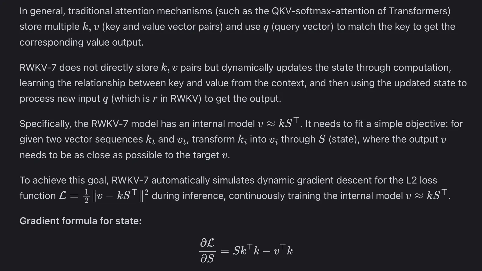 The key sentence here is RWKV-7 does not directly store k,v pairs in the hidden state, but updates the state by learning the relationship between them from the context.