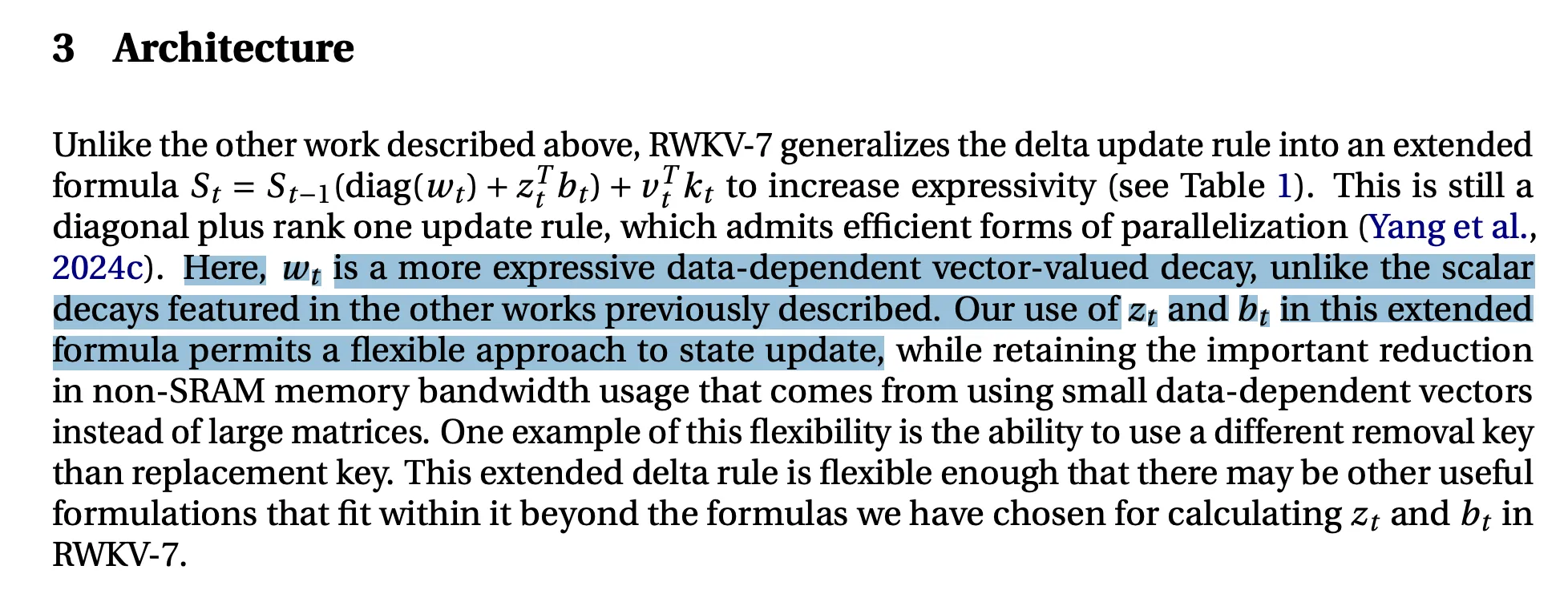 RWKV-7 has an interesting approach that differs form an LSTM and is inspired by DeltaNet. Googleâs recent paper âTitans: Learning to memorize at test timeâ, has a similar approach BlinkDL jokingly said "Google has caught on to RWKV-7 style models (my design with channel-wise factors is better)"