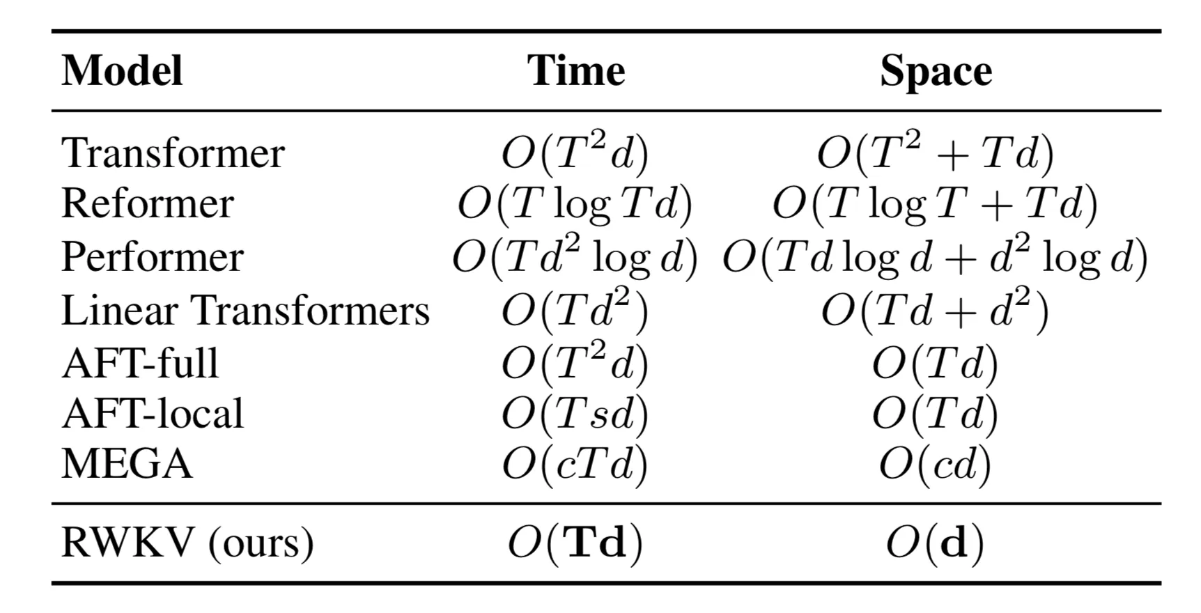 RWKV claims to balance this tradeoff of seeing the entire context length, while maintaining linear complexity. This table is from the original d=hidden dimension T=sequence length.