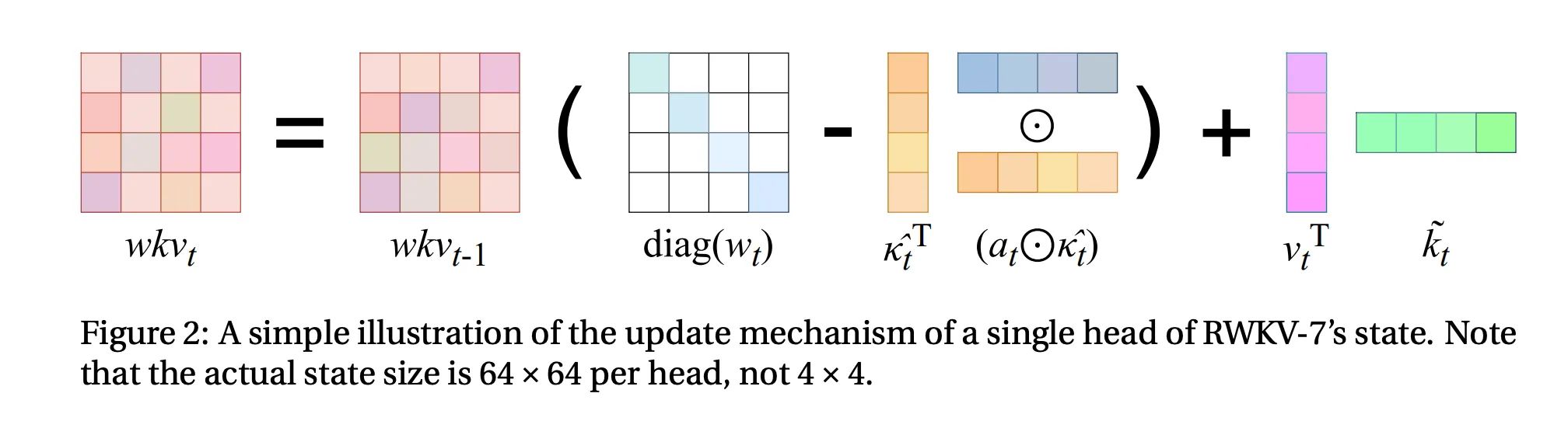 Similar to the parallelization we saw for the original RWKV, RWKV-7 can be written in a way that you can compute all the updates in parallel and then take the product at the end.