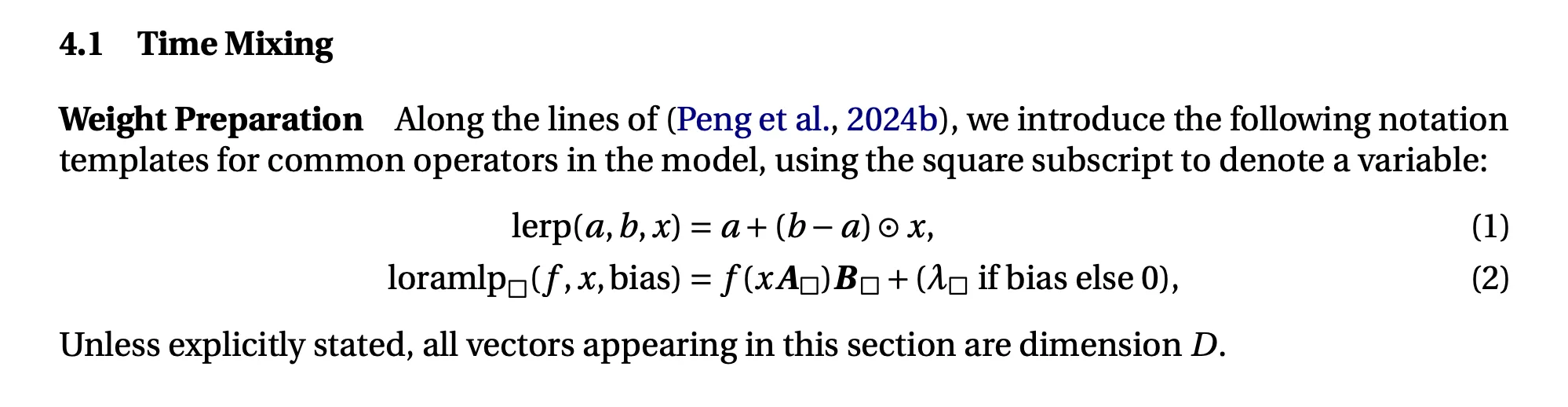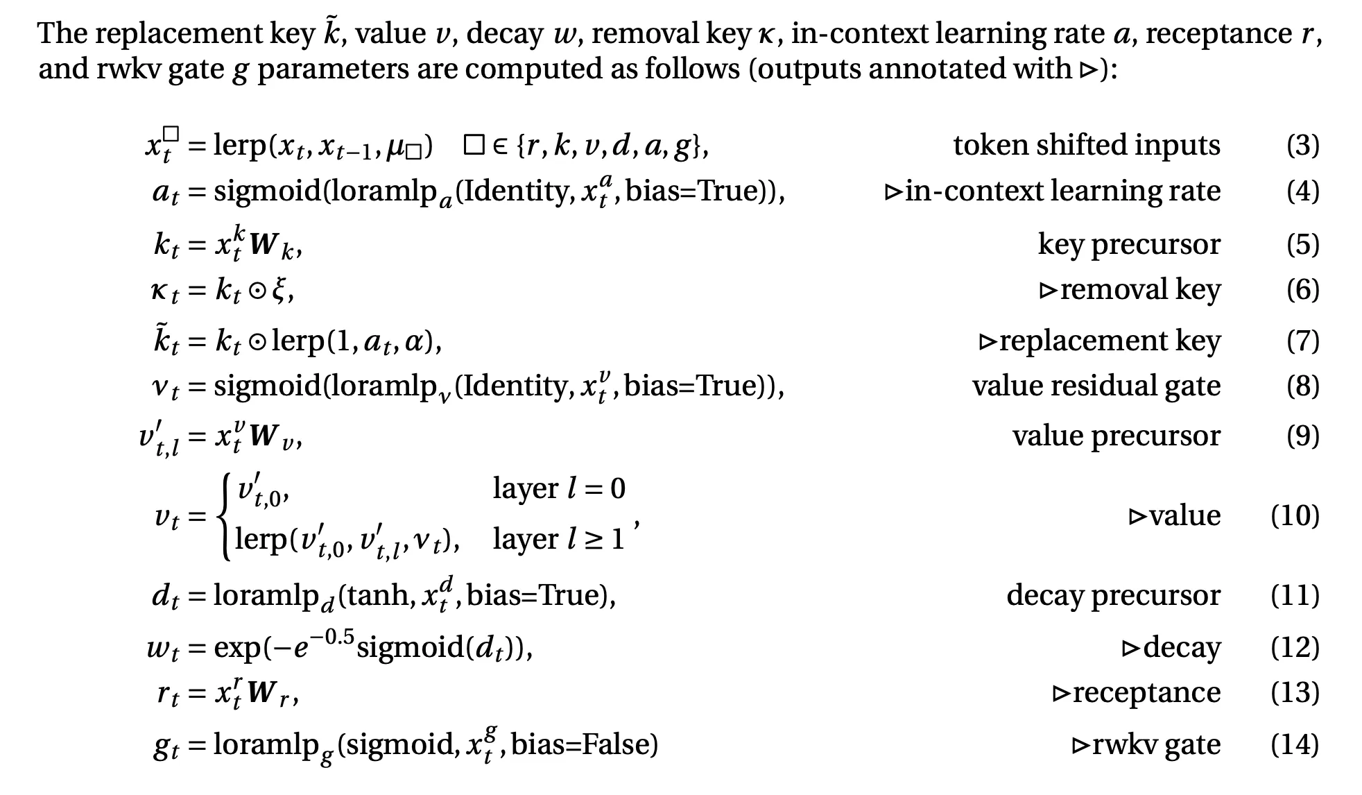 Note: wkv_t here is S_t (the state) from earlier, Iâm not sure why they redefined it as a more confusing variable name.