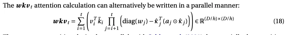 The way that this architecture is parallelized at training time is the fact that the w,k,v vectors are sums from the beginning of the sequence. This means we can compute them in parallel and just sum them at the end.
