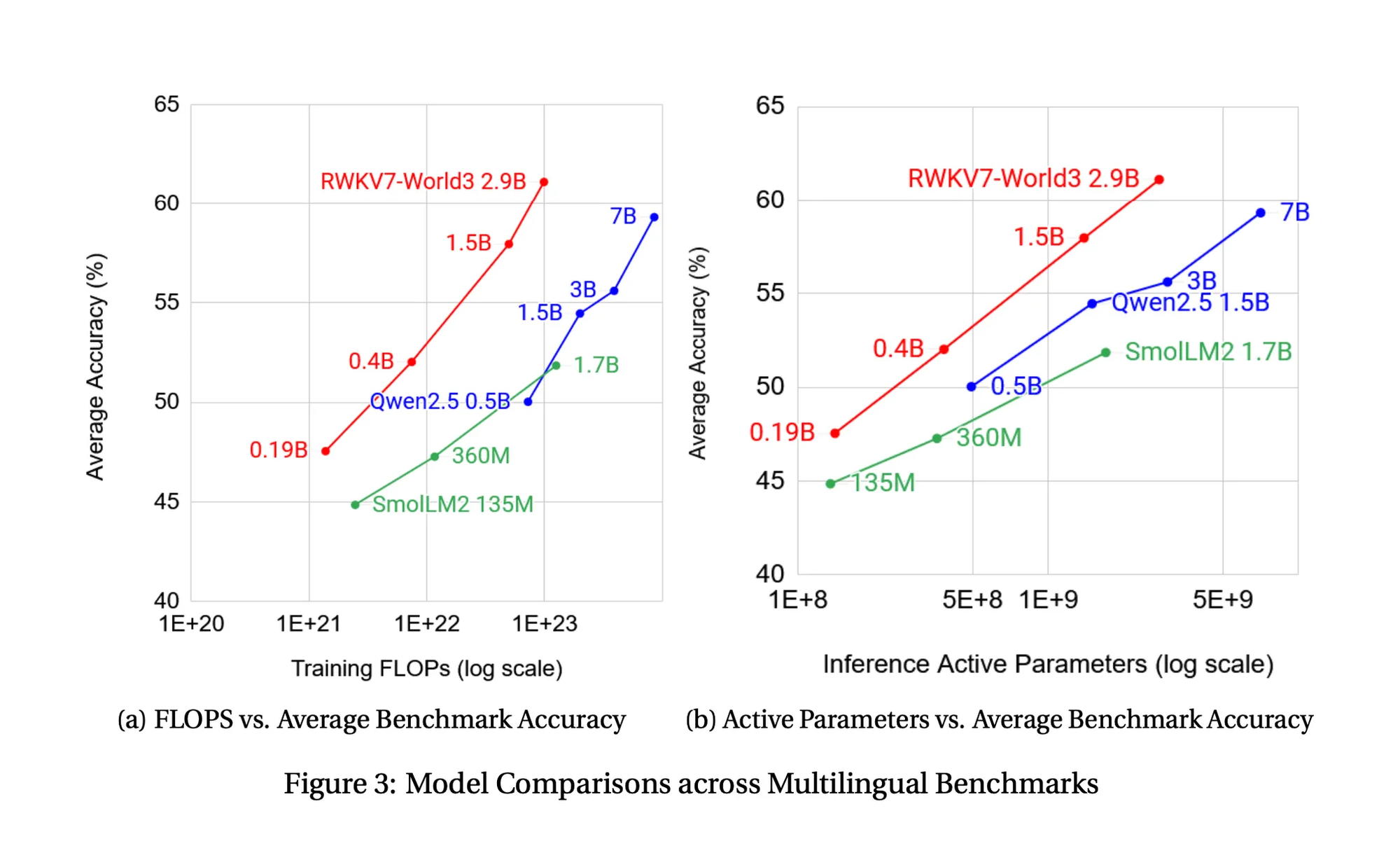 The 2.9B parameter model out performs even 7B parameter transformer models on a per-training-flop basis. Meaning it needs less compute and less parameters to get even higher accuracy.