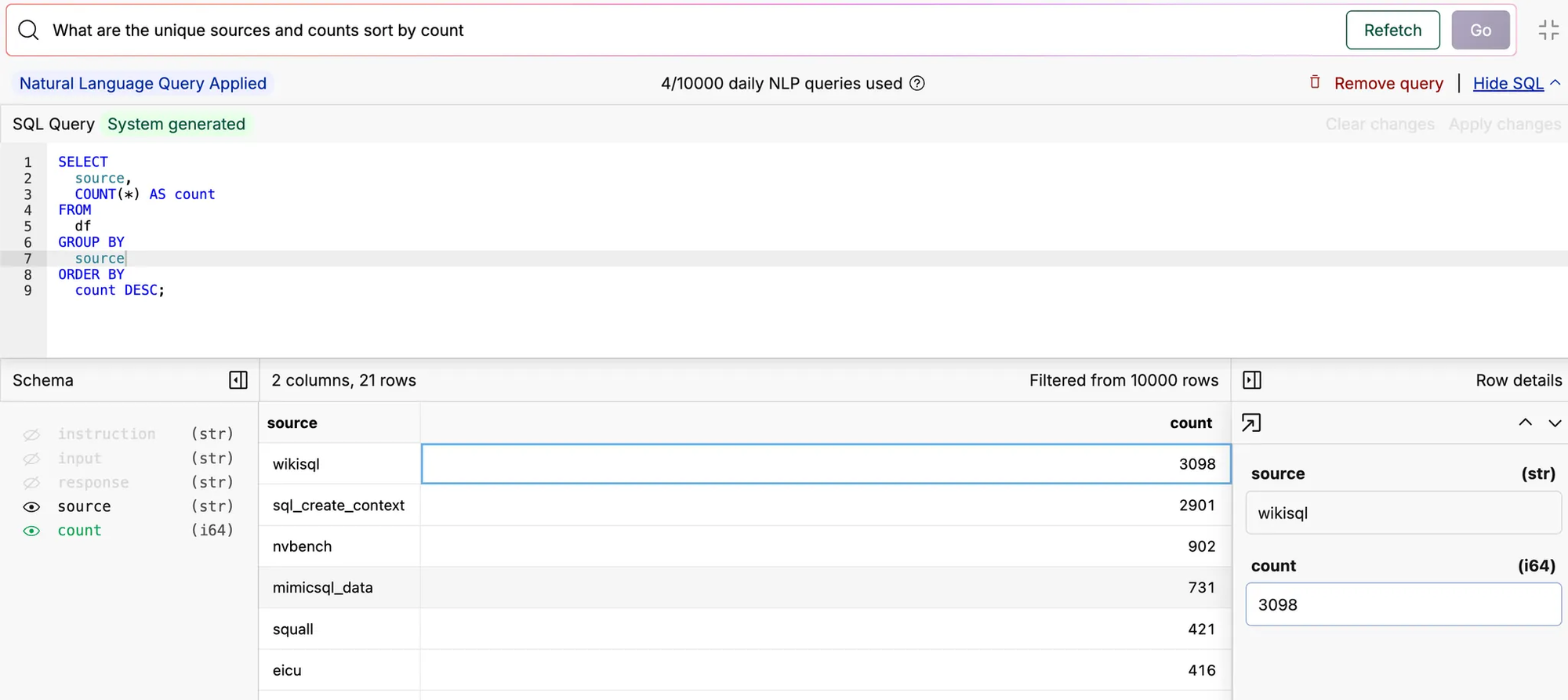 Personally, I wanted to test RWKV with the use case of generating SQL from natural language. If you donât know, we have the ability to query any dataset in natural language in Oxen.ai. We are currently using GPT-4o on the backend and it is costing us real $. My intuition is that this task, especially for a single table, can be done with a much smaller language model.