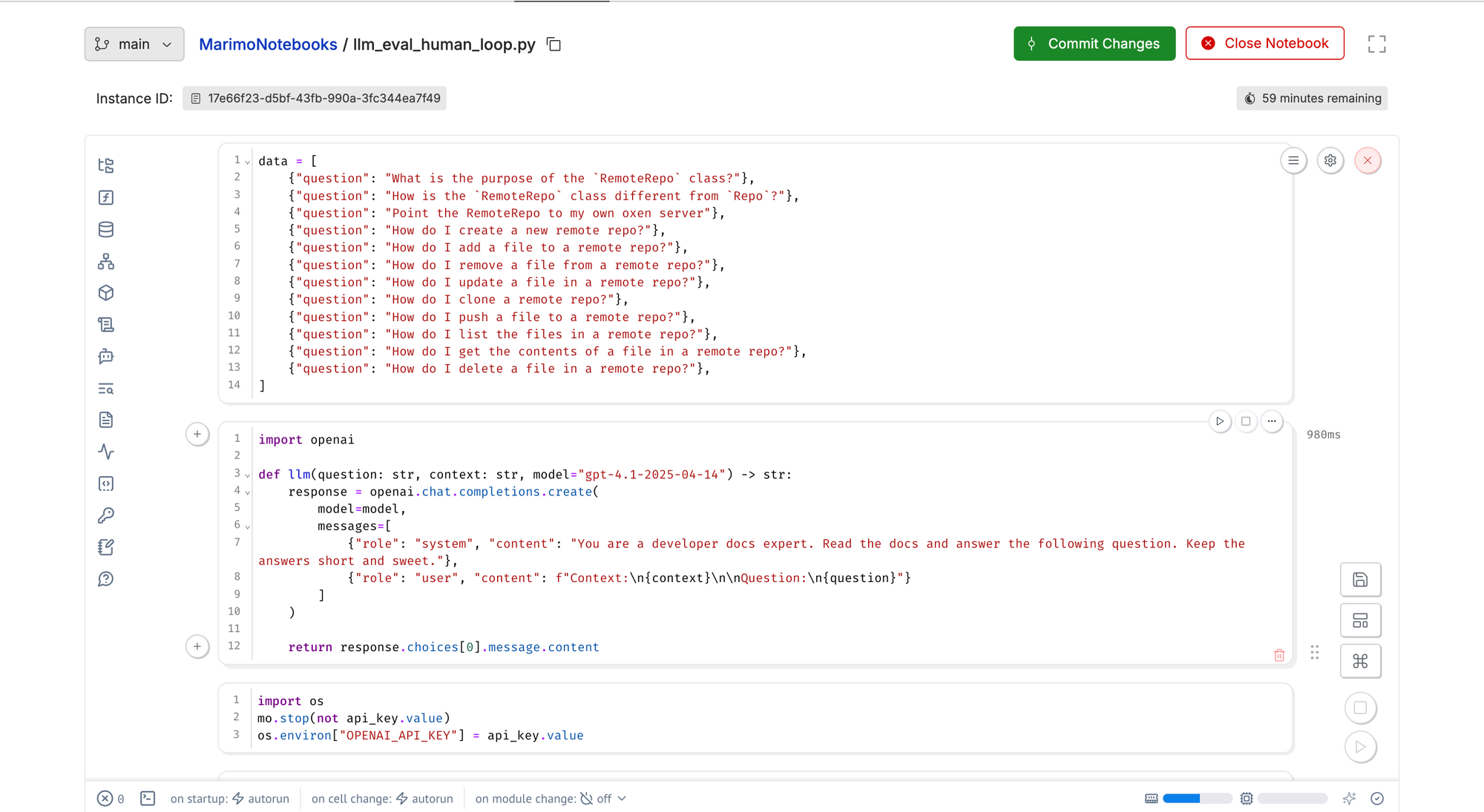 The with mo.status.progress_bar(total=len(df)) as bar: is a Marimo feature that allows you to display a progress bar in the notebook to help you visualize the progress of the loop. This is helpful when you have more than 10 examples and want to know how much longer the loop will take.