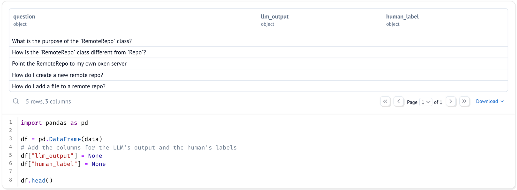 Take this example as a starting point, and build your own labeling tool to fit your needs. You may want to add a score, or a reason for the label, or even a more complex UI that lives outside of the notebook. If you don't need a custom labeling workflow, feel free to use the built in DataFrame UI in Oxen.ai that feels like editing a spreadsheet.