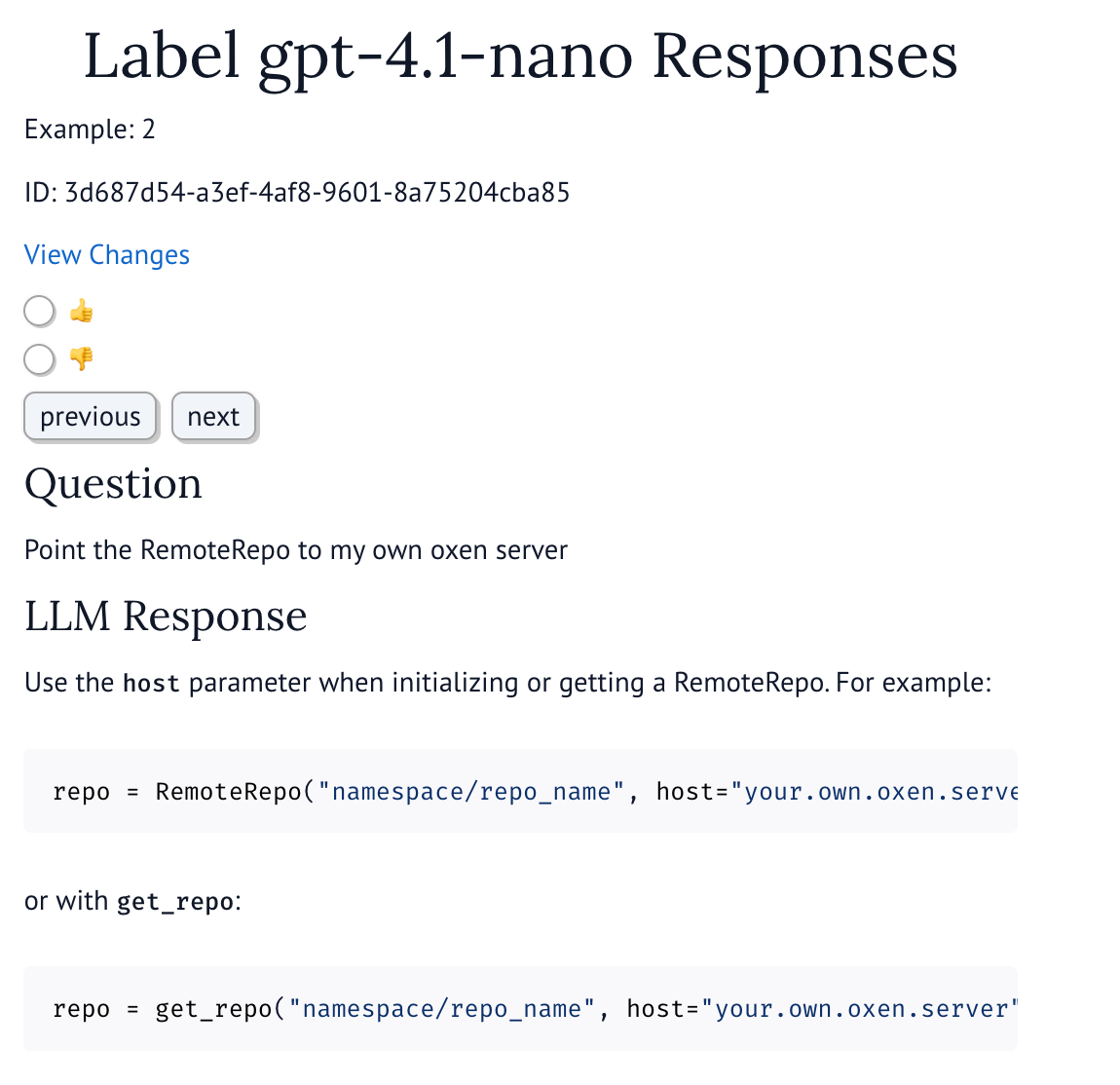 This tutorial will show you how to build a simple labeling tool that allows a human to review the output of an LLM, and give a thumbs up or down (👍/👎), prompt an LLM with context, save the outputs, and build an interface to have a human review the output all using Oxen.ai's Notebooks. All your labeled data will be versioned and stored in an Oxen.ai repository so that you can always go back and see how the model's performance evolved over time and iterate on it with your team.