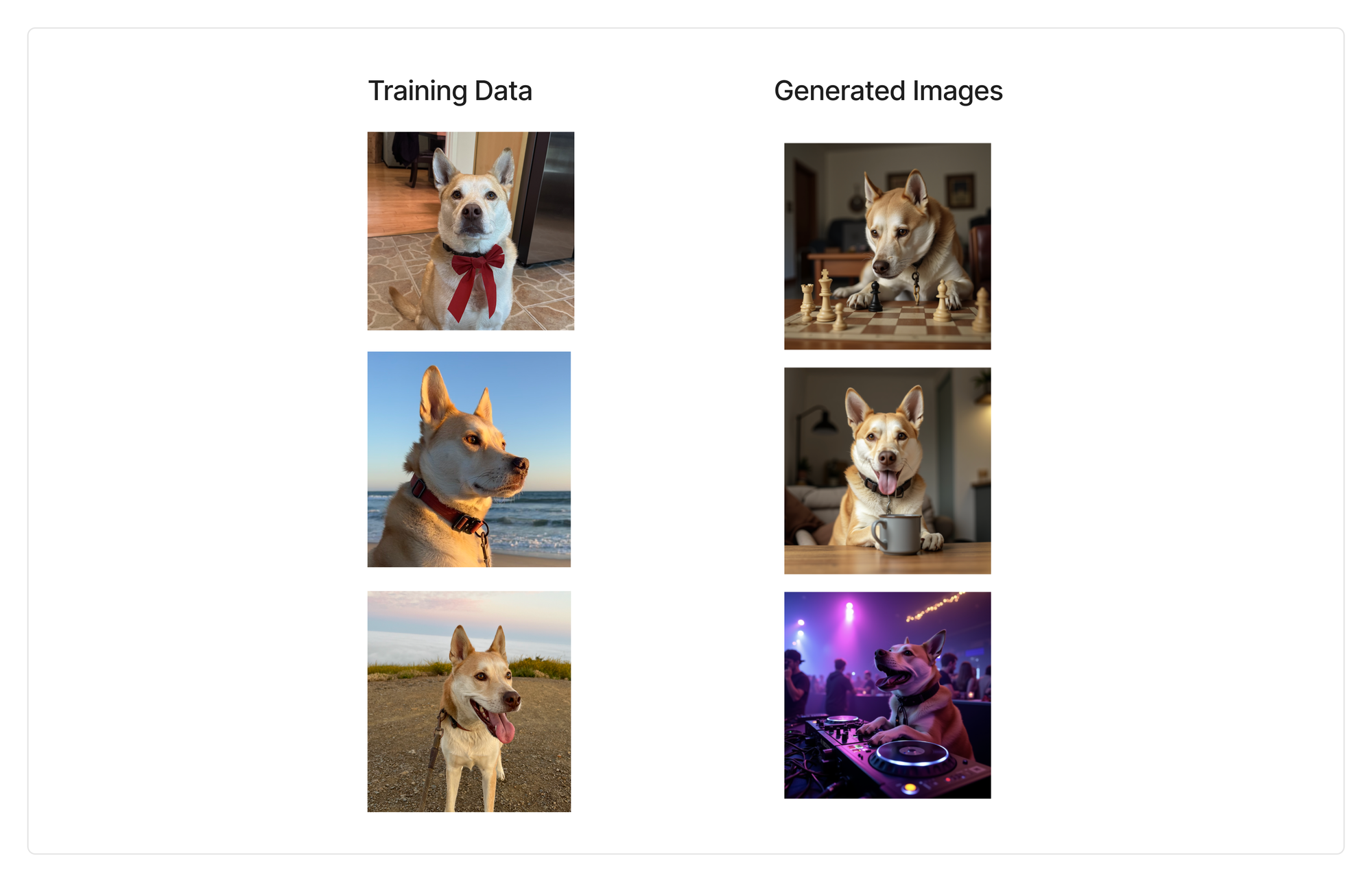 If you haven’t seen examples generated by a fine-tuned FLUX model, they are of very high quality. For example, here is a quick experiment I ran using the code below. I took 20 images of my dog from my camera roll (left column) and was able to fine-tune FLUX to generate the images on the right.