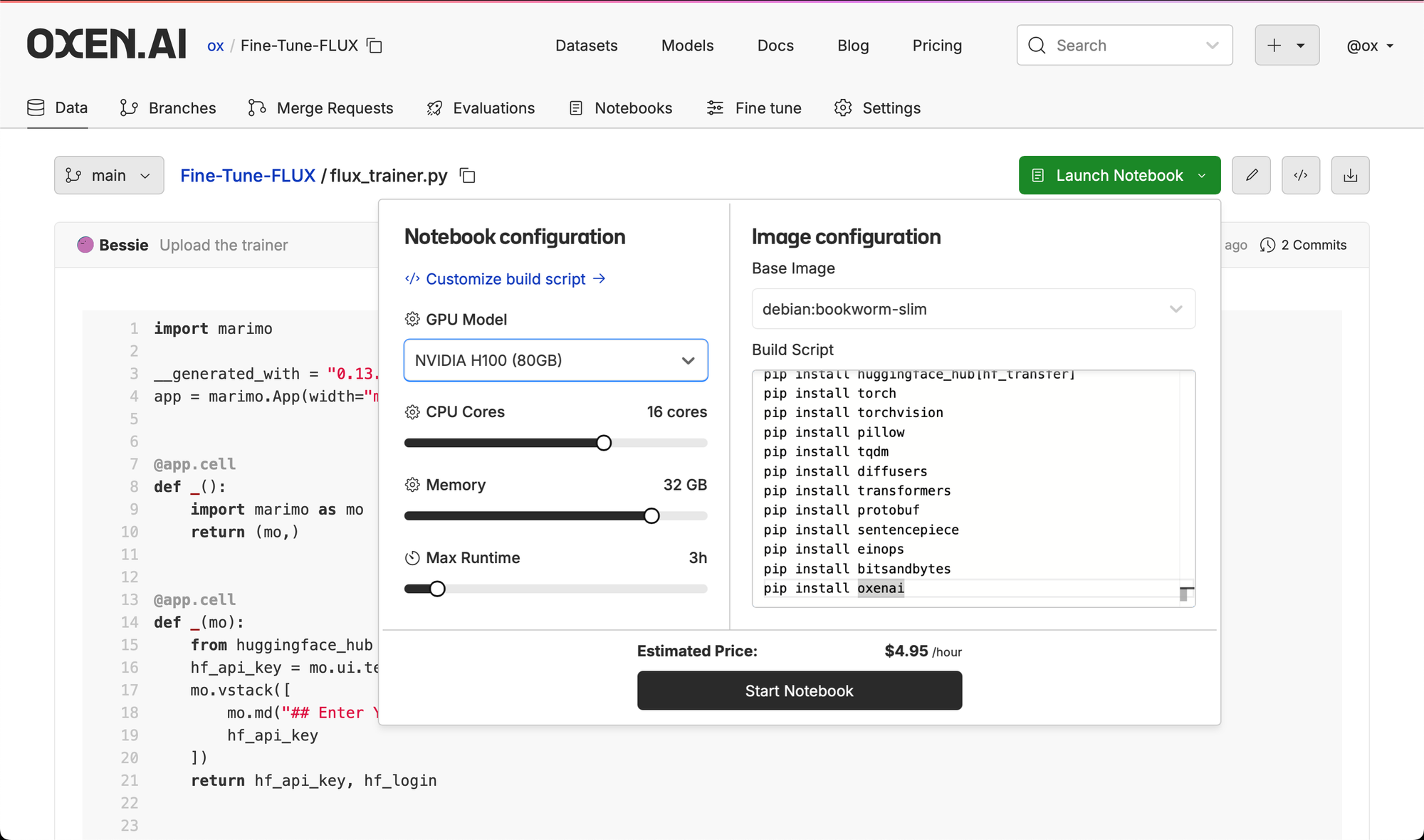 pip install oxenaiWhen running in Oxen.ai, simply upload your file, click "Launch Notebook", and provide your dependencies in the custom build script. Be sure to select a beefy GPU like the H100 with enough memory.