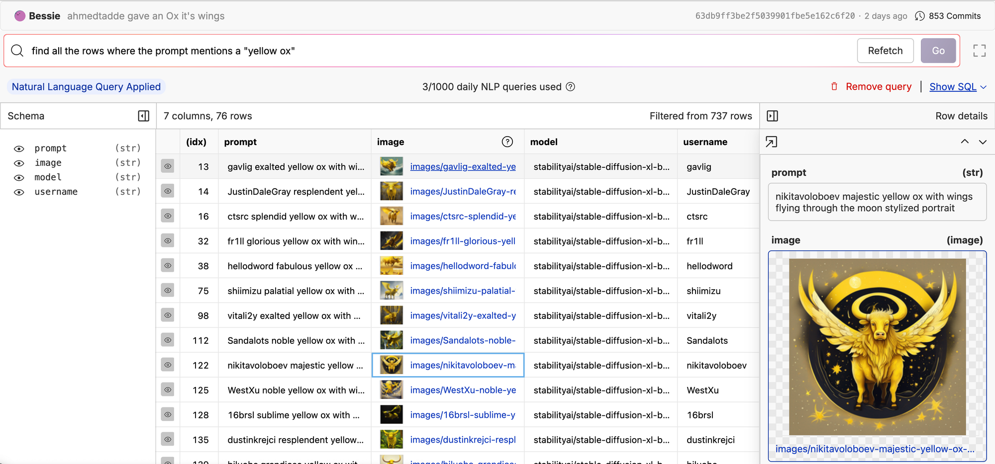 For example, here we are searching our ox/FlyingOxen repo for all the yellow oxen. We translated the user-input text from "find all the rows where the prompt mentions a 'yellow ox'" to SQL, and now we can see all images with a prompt that contains yellow ox.