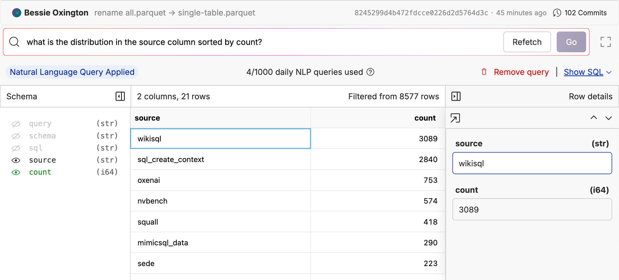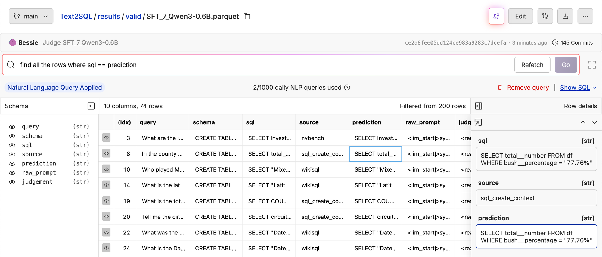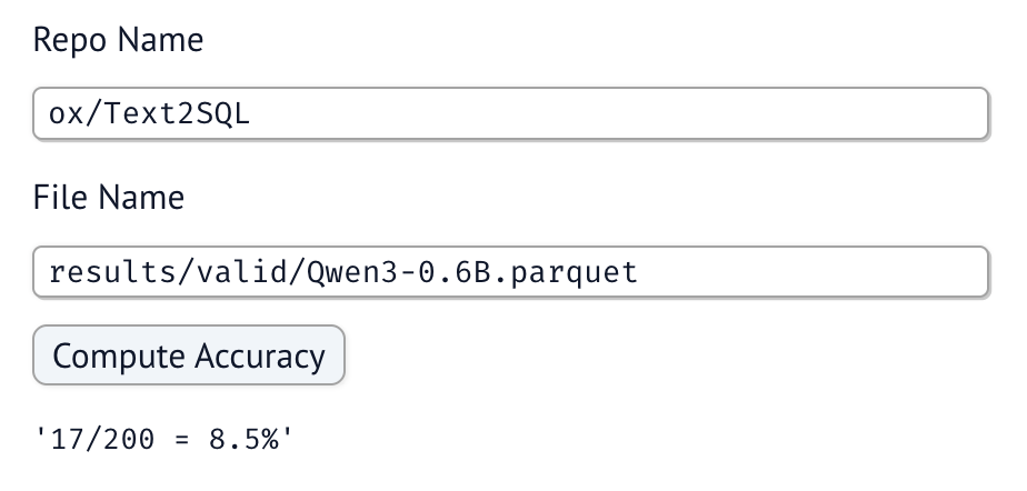 Test: https://www.oxen.ai/ox/Text2SQL/file/main/test.parquet