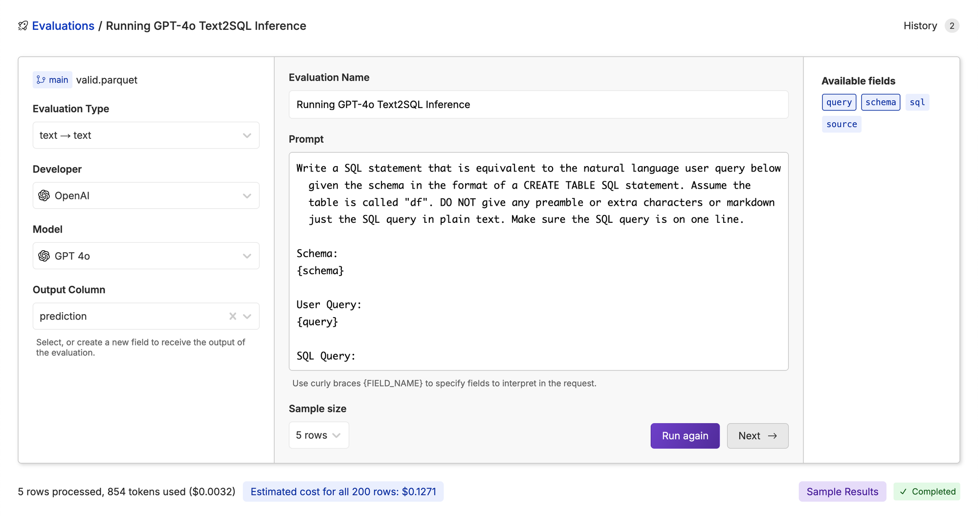 SQL Query:It’s important to look at the sample responses as a gut check before running the model on the full dataset.