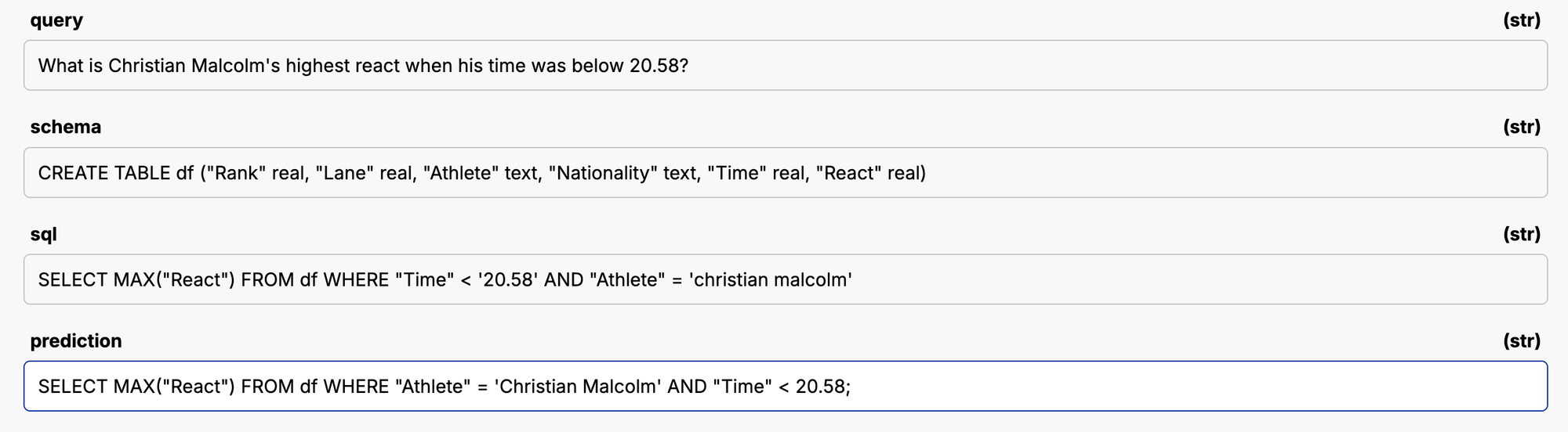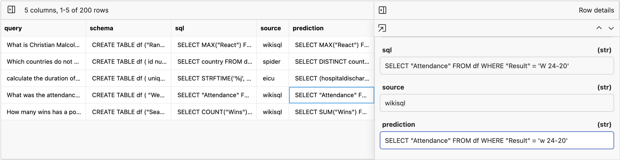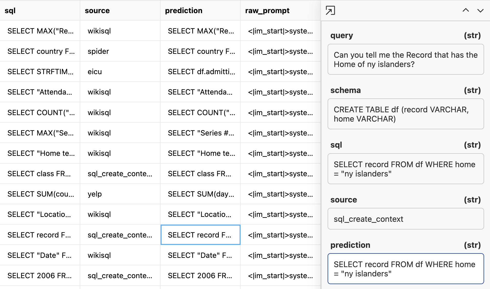 When it is done, we will have a dataset of expected sql and a prediction from the model. In a perfect world, the SQL statement is a direct string match with the model prediction like below.