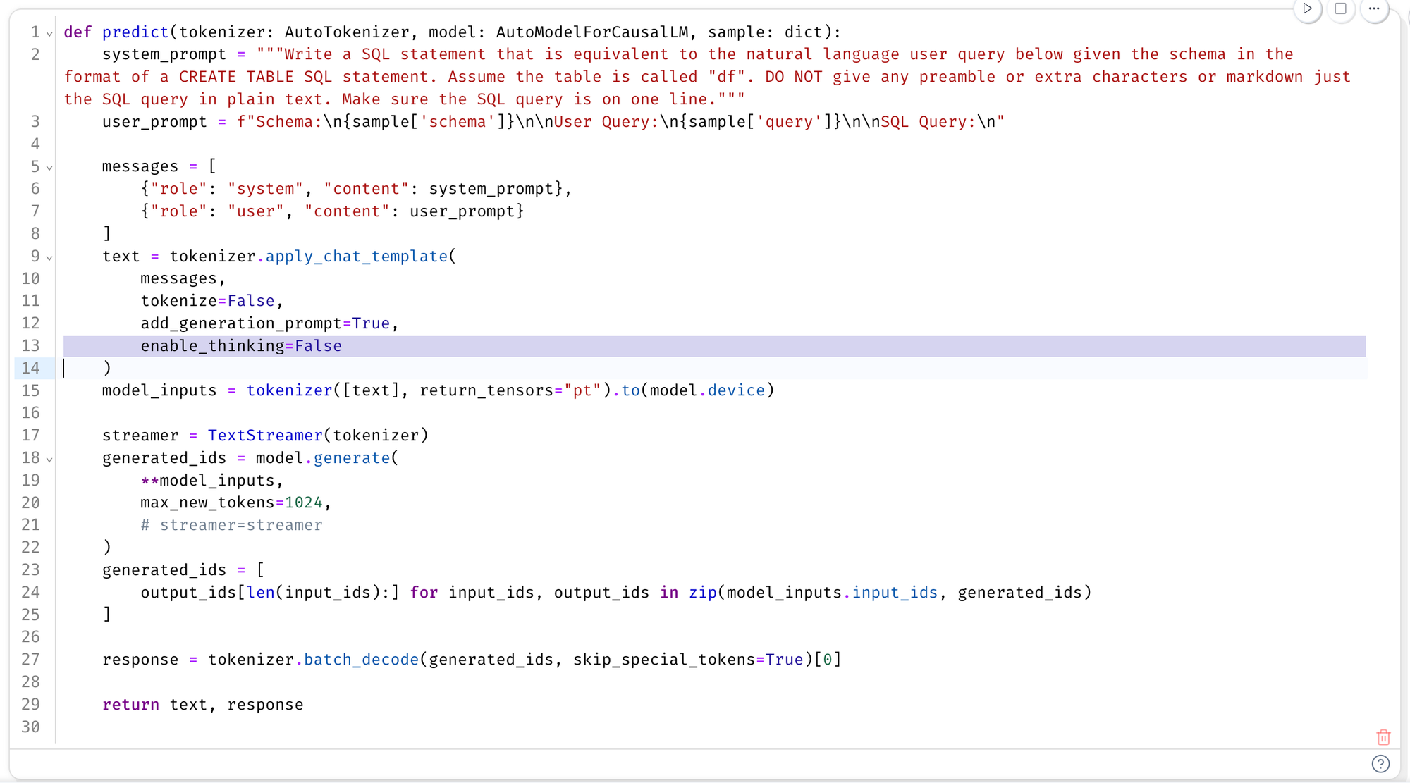 The most important line to disable “thinking” is line 13 in the predict function below. The rest is pretty standard given the transformers library. We are using the prompt as before, putting the instructions in the system prompt.