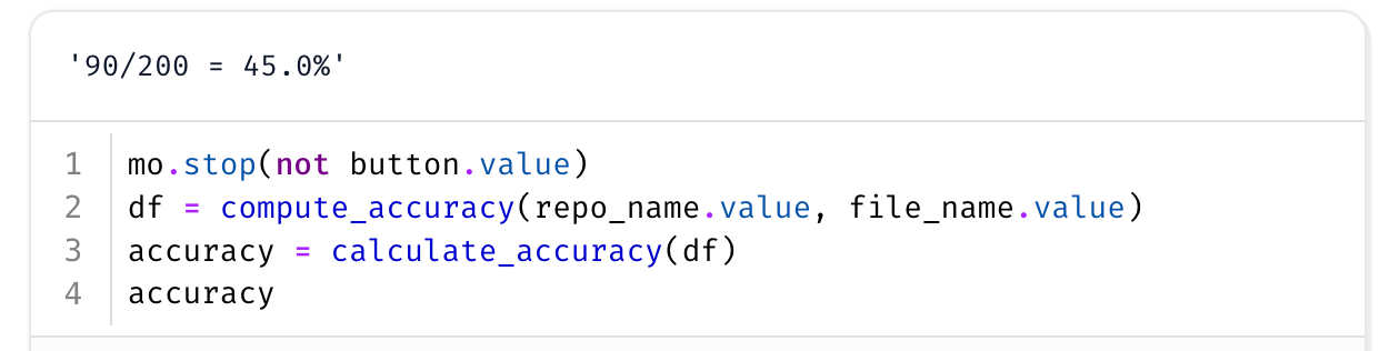 The notebook allows us to put in a repo and filename and compute the accuracy. Under the hood we use a simple regex to extract the answer from the xml.