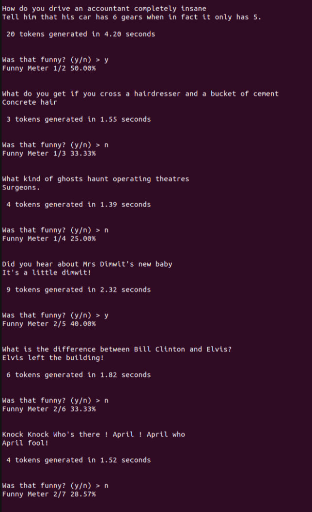 Next we want to get a better sense of how funny our quantized, fine-tuned model actually is.