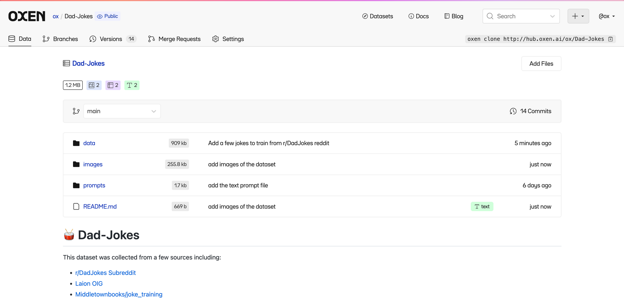 oxen remote download ox/Dad-Jokes data/train.parquetNote: I have found the load_dataset function works better with parquet files and sometimes gets hung up on jsonl, so the data has been concatenated together into a parquet file with a single "text" field.