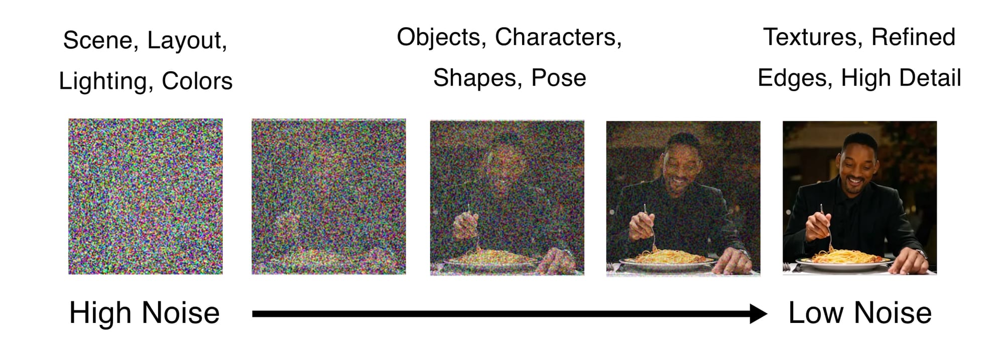 Early stage (high noise): The model focuses on the big picture. It sets up the overall scene layout, decides if it's day or night, places people and major objects in roughly the right spots, and chooses the general colors and lighting mood.
