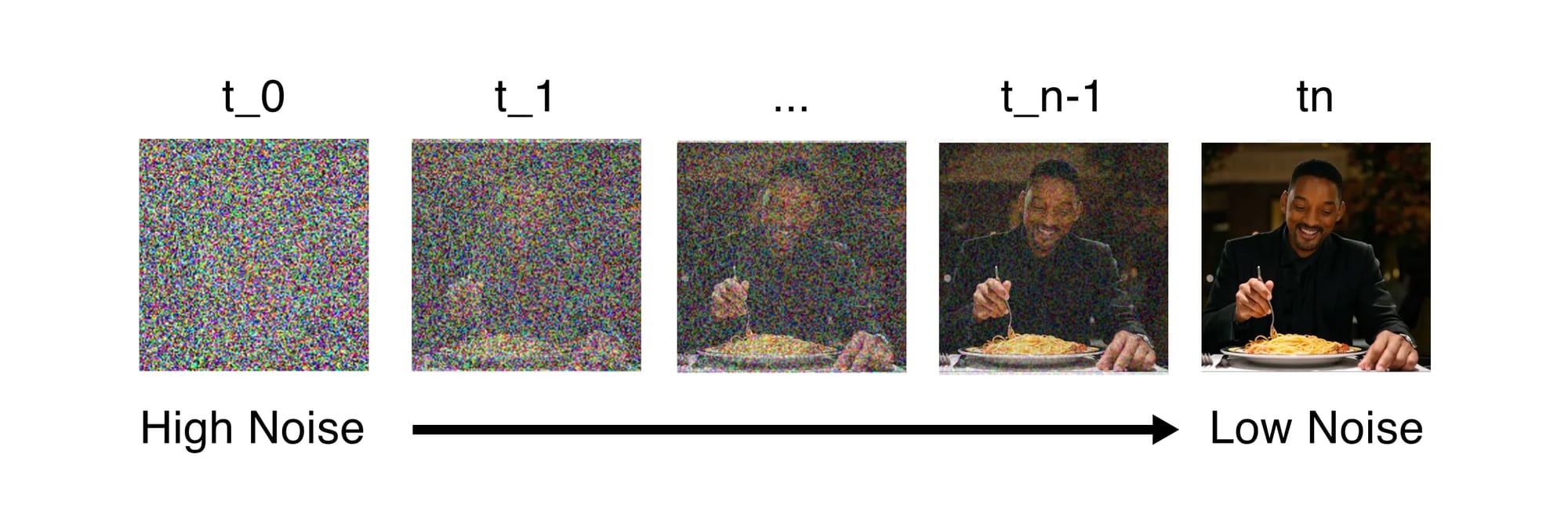 Diffusion models are trained through a process that converts a noisy image, to a clean one, by iteratively removing noise over time. To be honest, it feels like magic that it works at all. You start with "high noise" at the first timestamp (t_0) and end up with low noise at the last timestamp (t_n). Each step in between (t_1, t_2, t_3, etc...) the model's job is to remove a little noise and move towards a realistic looking image.