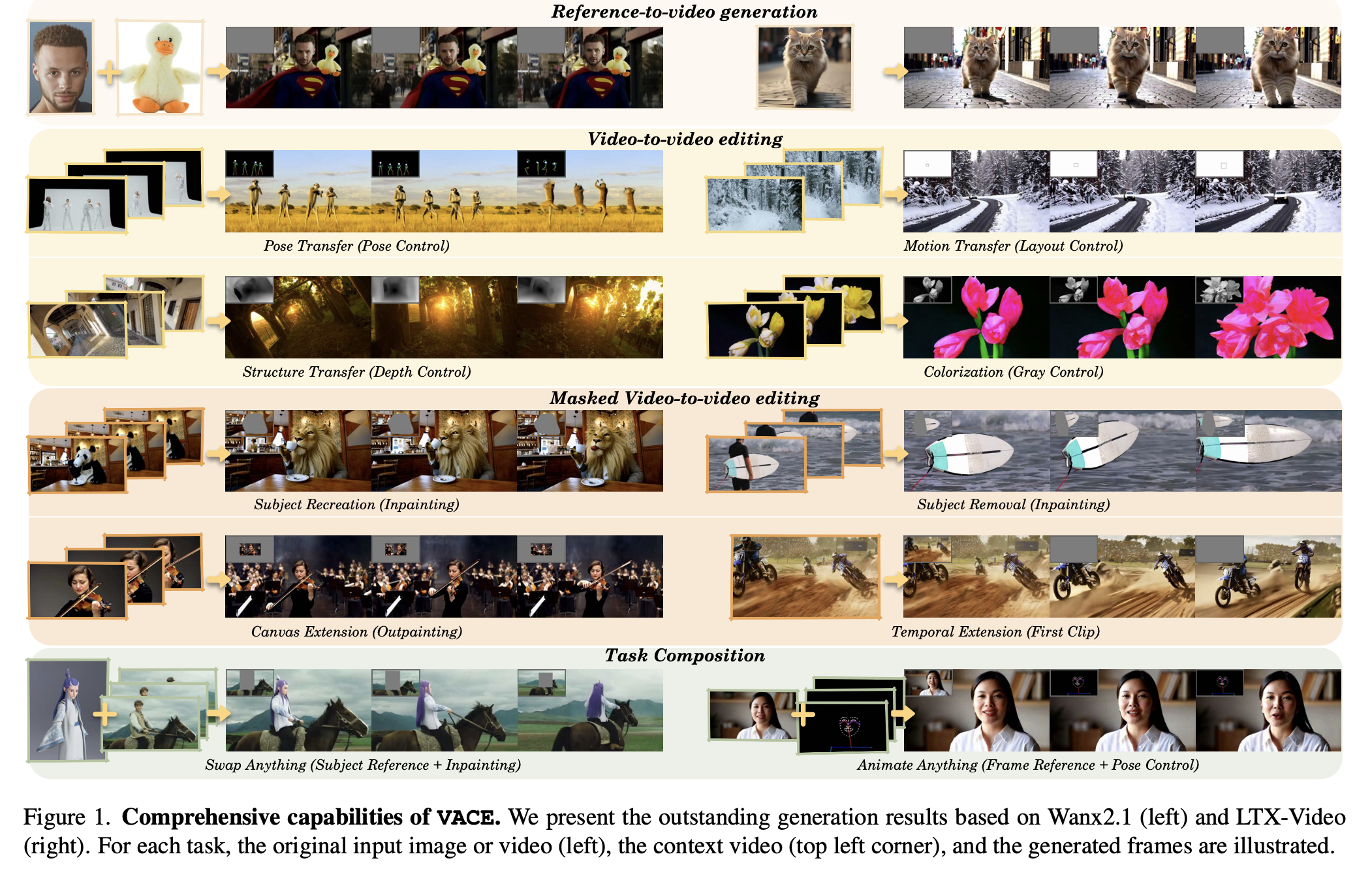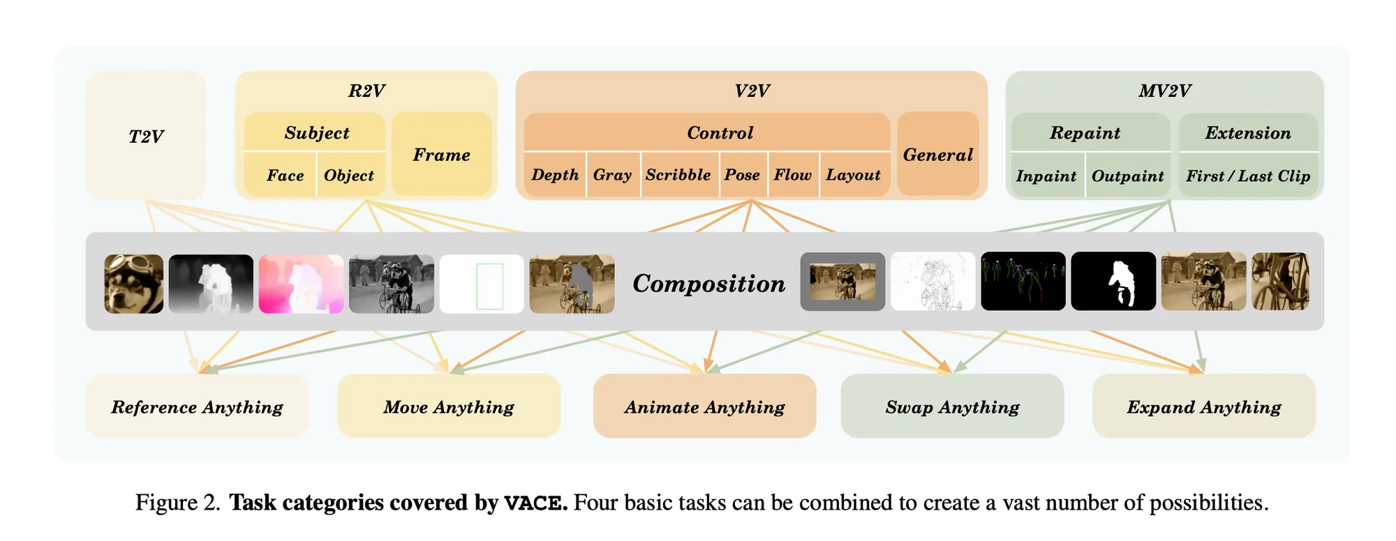While a lot of models go straight from text to a video, or from an image to video, VACE has been trained to understand many different video editing tasks.