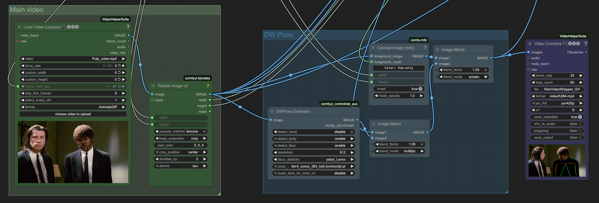 The next piece of input that was helpful for this particular workflow, and any replacement involving humans, is adding in pose estimation. In this case we will use the DW Pose estimator and combine and combine that with the masked region to guide the generation.
