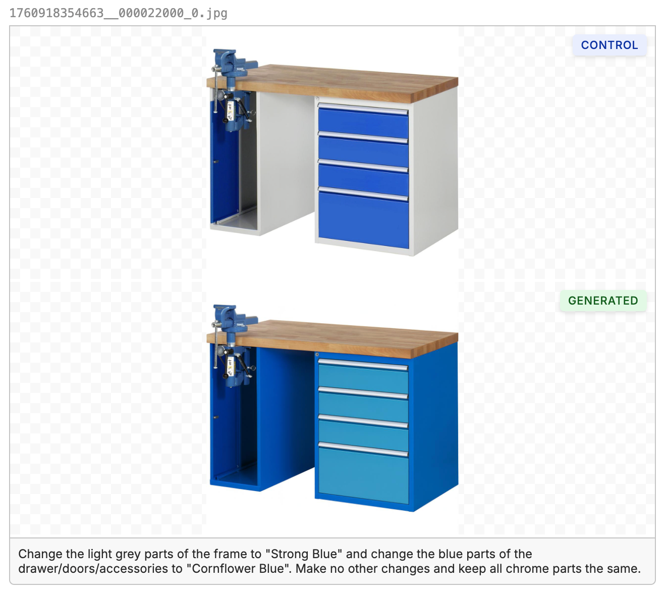 After the first round of synthetic data generation, our client realized the results weren’t yet production-ready. They brought in editors to manually refine the images in Photoshop, transforming the imperfect generations into high-quality training data. Some color combinations proved particularly challenging for the base models, for example, the light blue and dark blue desk shown below.