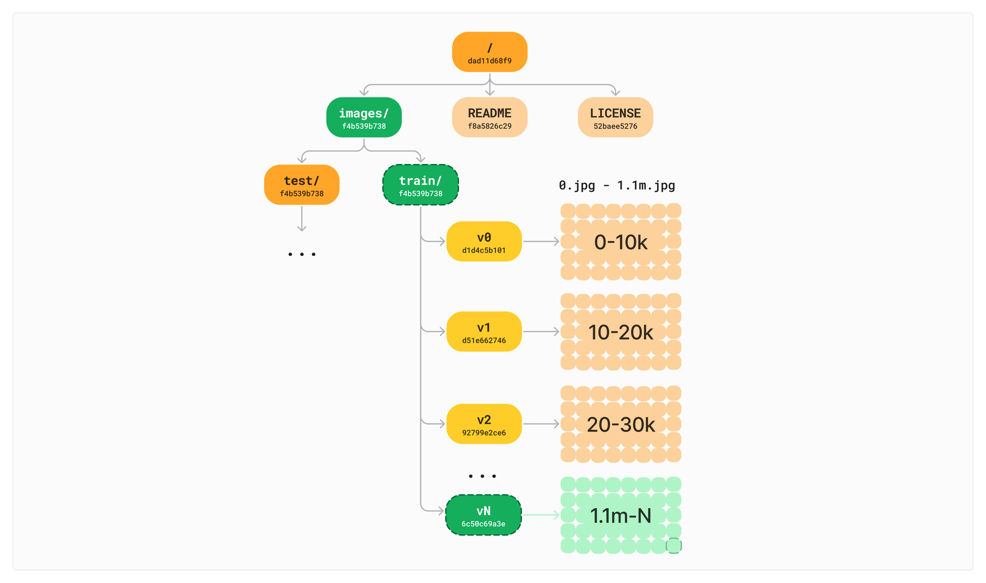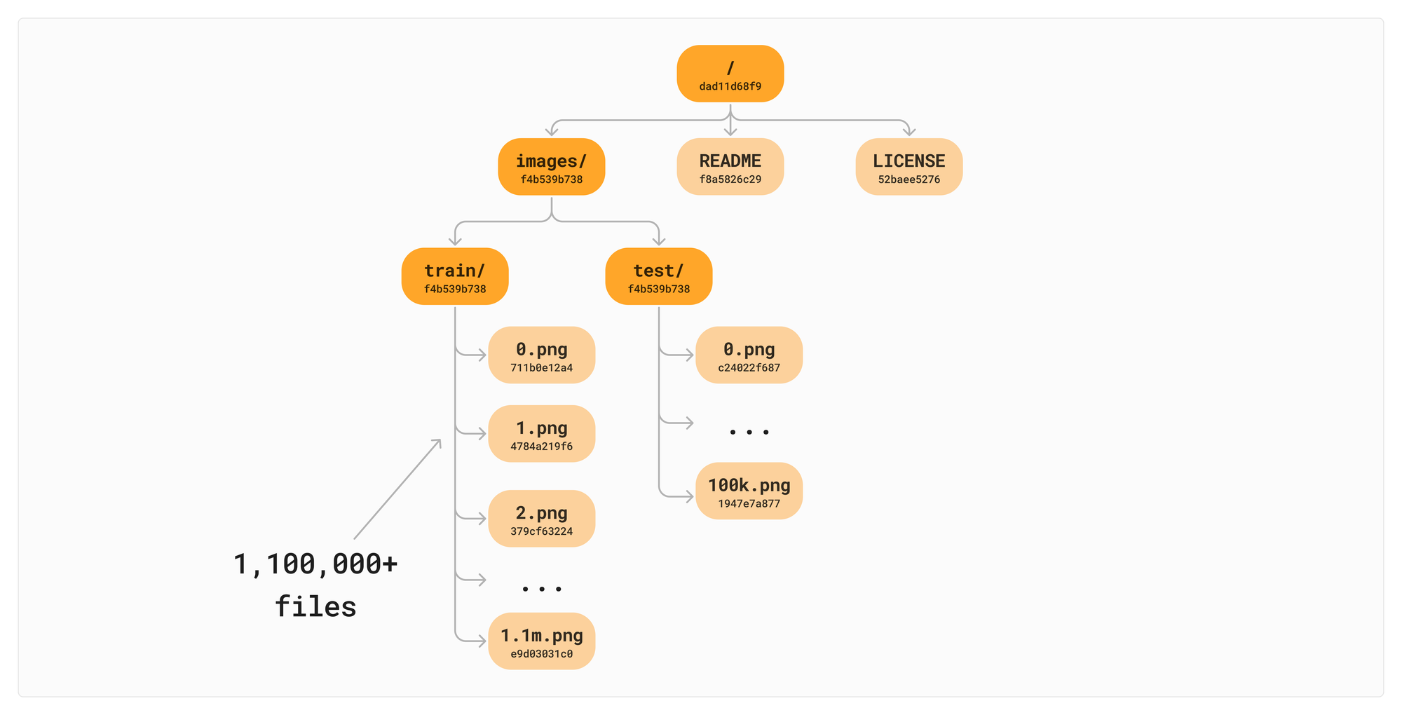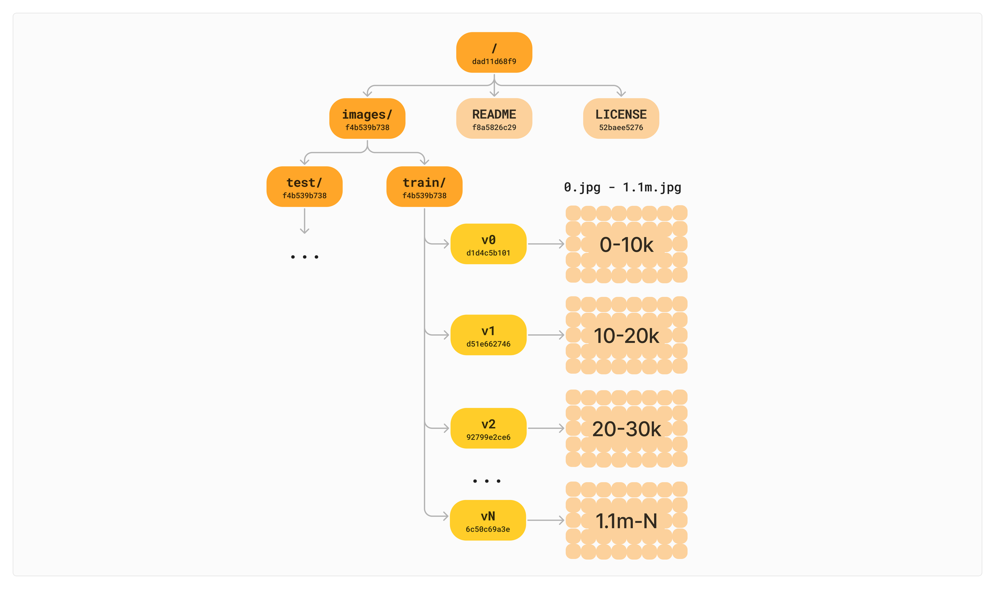 It may not be obvious what the benefit of these intermediate nodes is right out of the gate. In fact, it seems like it is adding an extra layer of indirection and more data to our tree - not less. To bring this concept to life, letβs walk through ImageNet as an example to see where VNodes can help speed up reads, writes, and diffs all while minimizing overall data duplication.