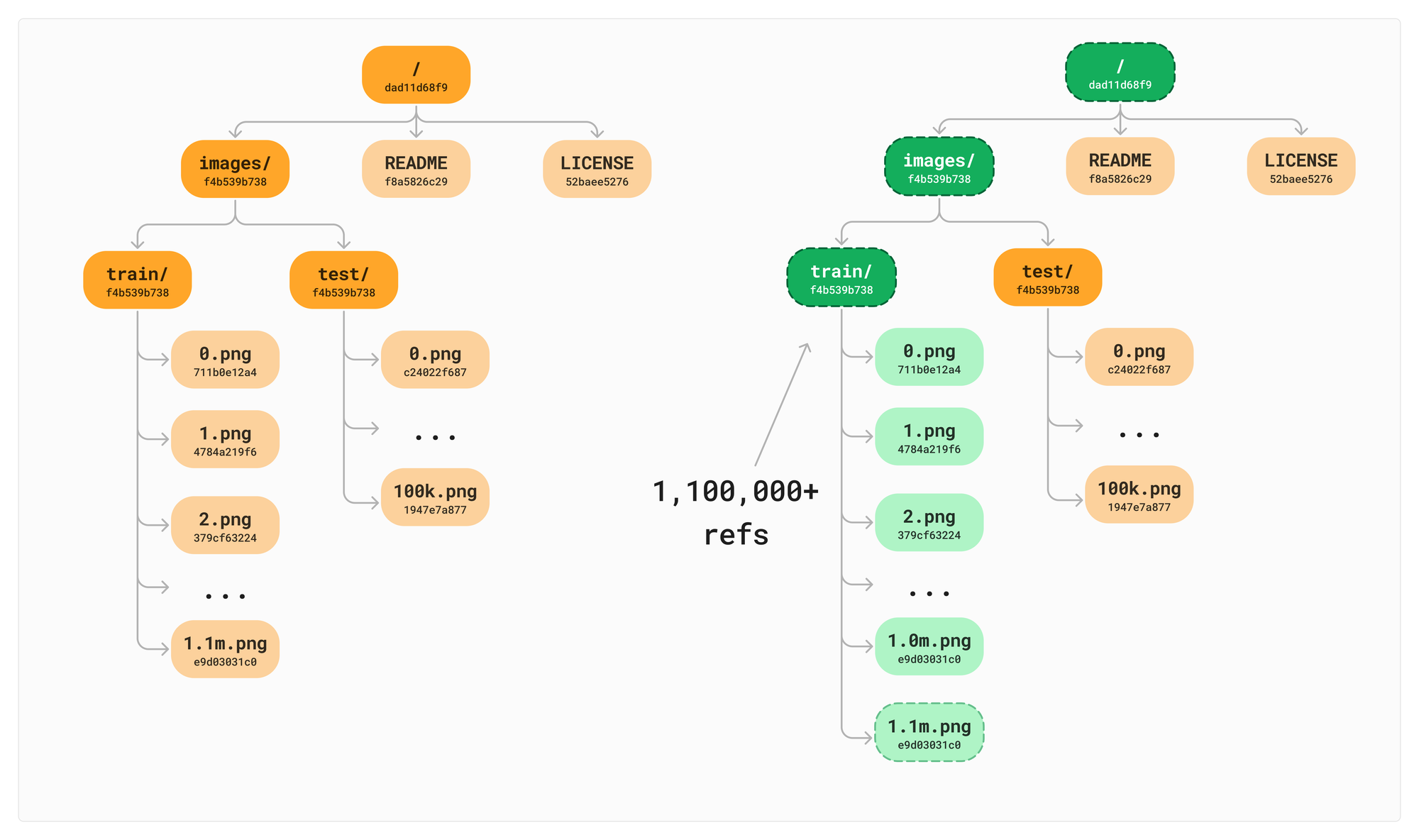 Even though references are lighter to copy than the full files themselves (we do not copy the file data, just the refs) that is still 1.1 million writes we need to do to simply add a single file. Imagine if these were rows in a traditional database. We would definitely want to avoid 1.1 million add row operations to keep track of the file list and hashes on each new version. If we do this for more than 2 commits, the number of references quickly gets out of hand. We will have > 10 million references after just 10 commits, even if we only added 10 new files.