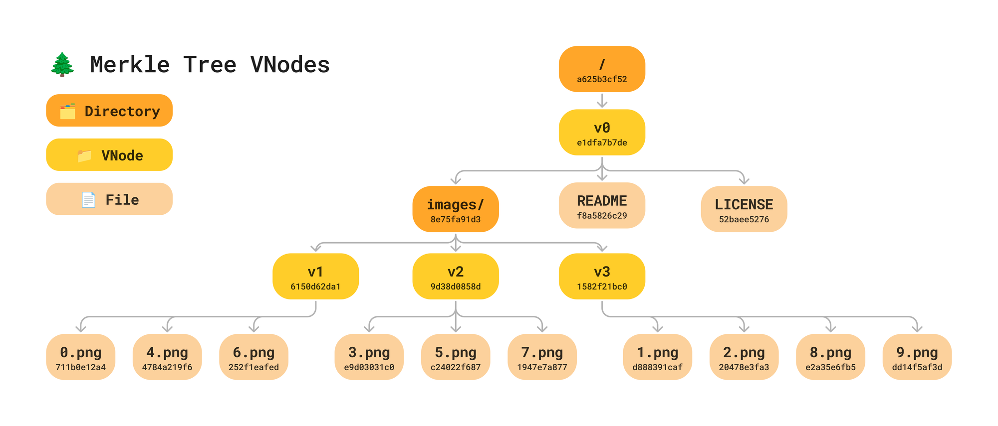 If you recall how we find differences in our Tree from Merkle Tree 101 we start at the root node, compare hashes, and only traverse further if the hashes do not match. The most expensive part came from scanning every file at the directory level. VNodes make it so there are more chances for early stopping, and limit the longest contiguous scans to the vnode_size.