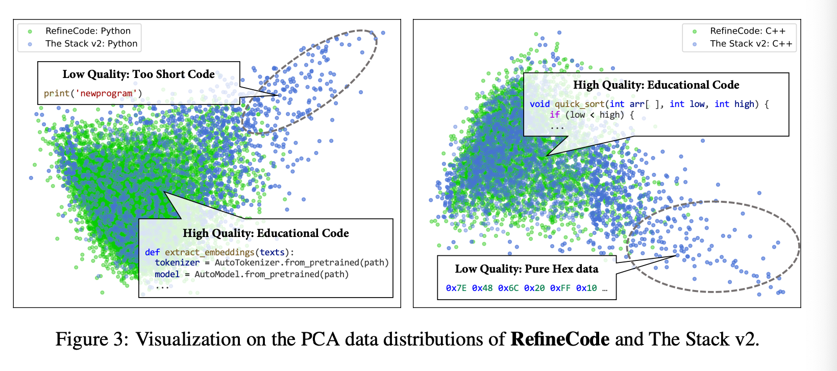 How well does all the cleaning and filtering work? They looked at PCA of embedding extracted from Code-BERT model on the two distributions.