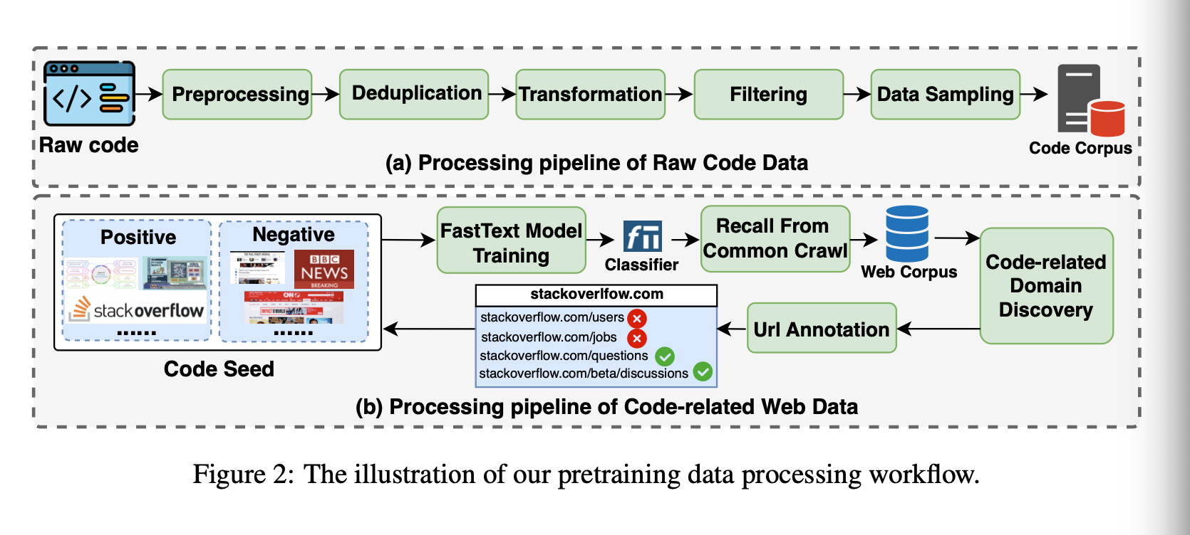The pre-training stage is simply predicting the next token from a large corpora. This corpus was generated and curated with the following 5 steps: