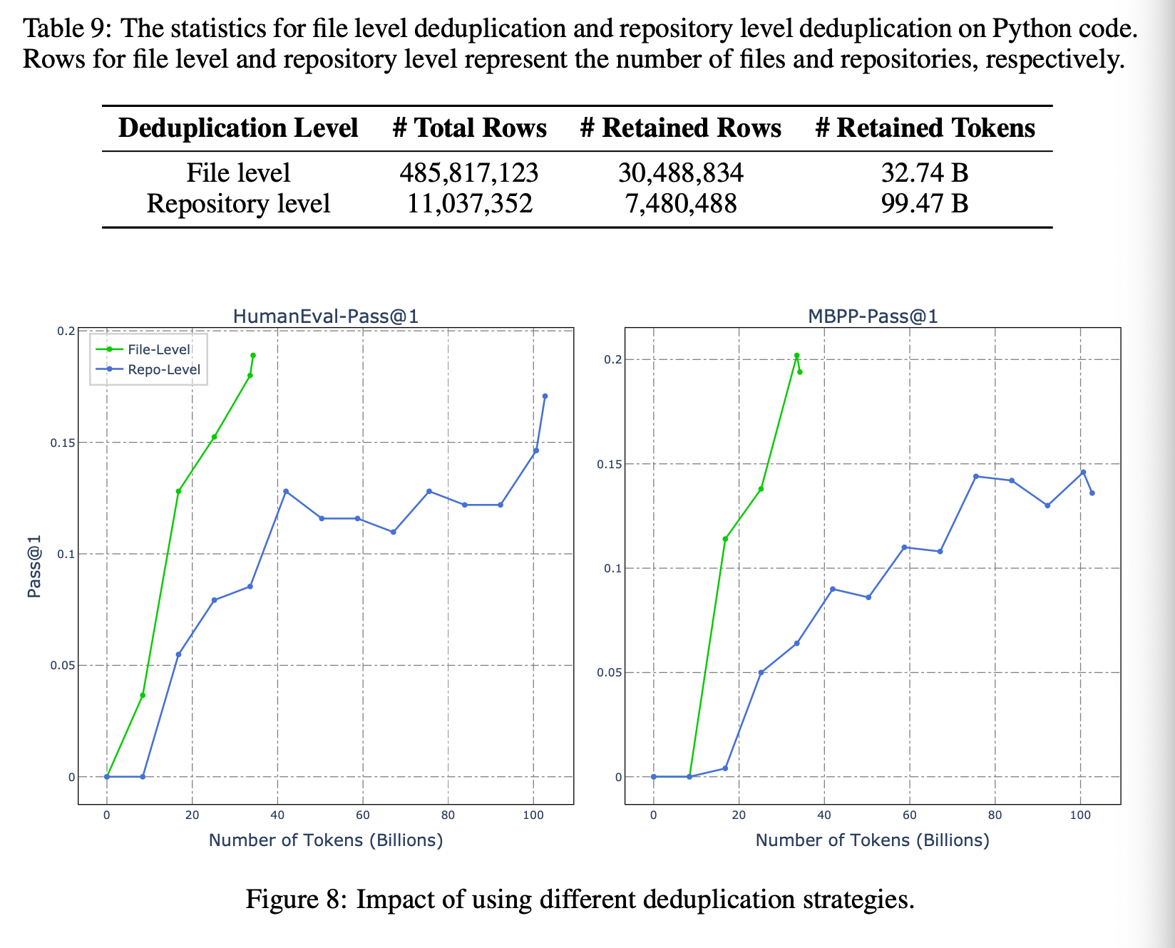 Deduplication at a file level seems to have a large impact on performance per token.