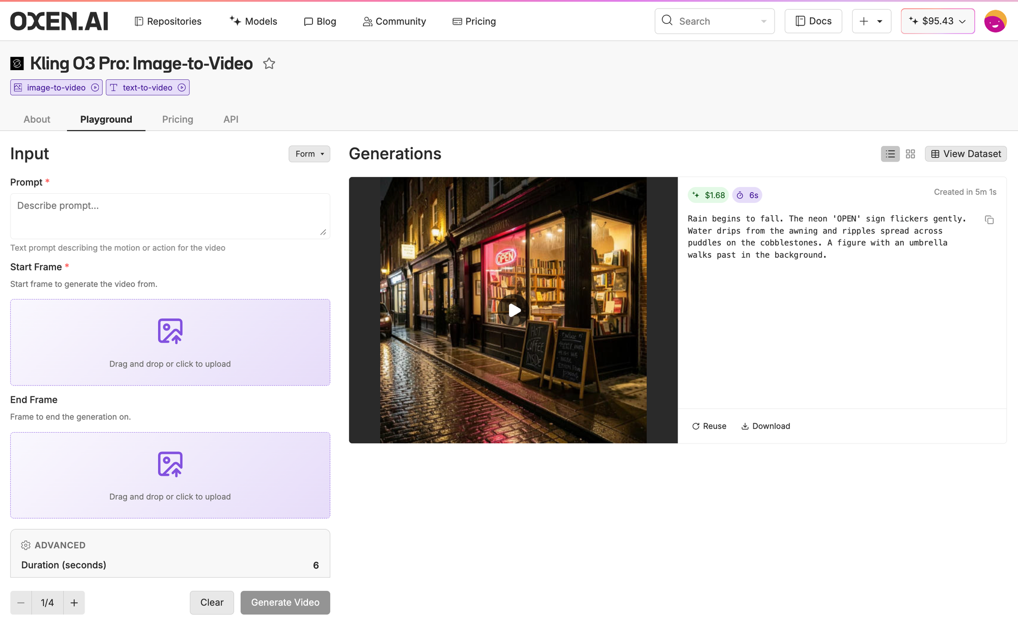 Little note: these Kling models can take both start and end frames, we're just using start frames for this experiment, but you can easily pass both in our new Oxen.ai Playground!