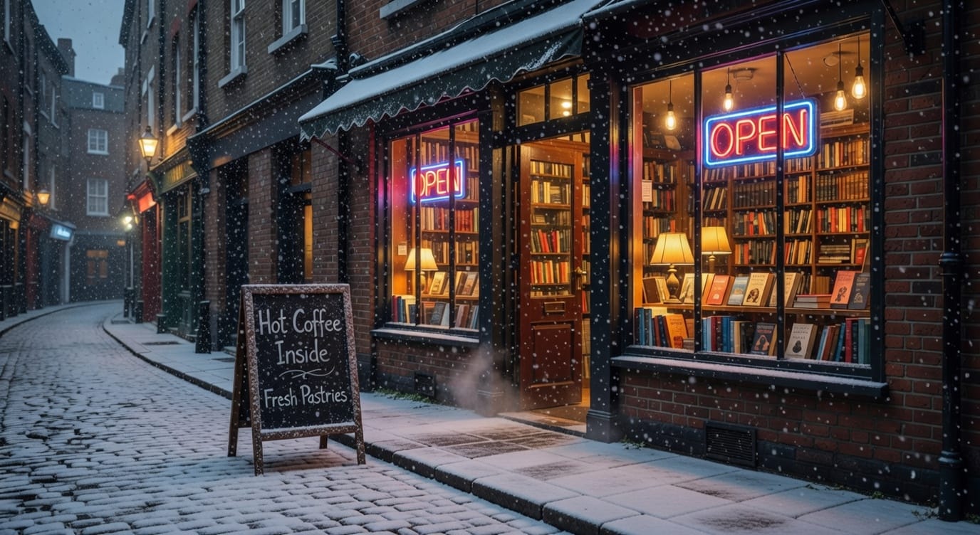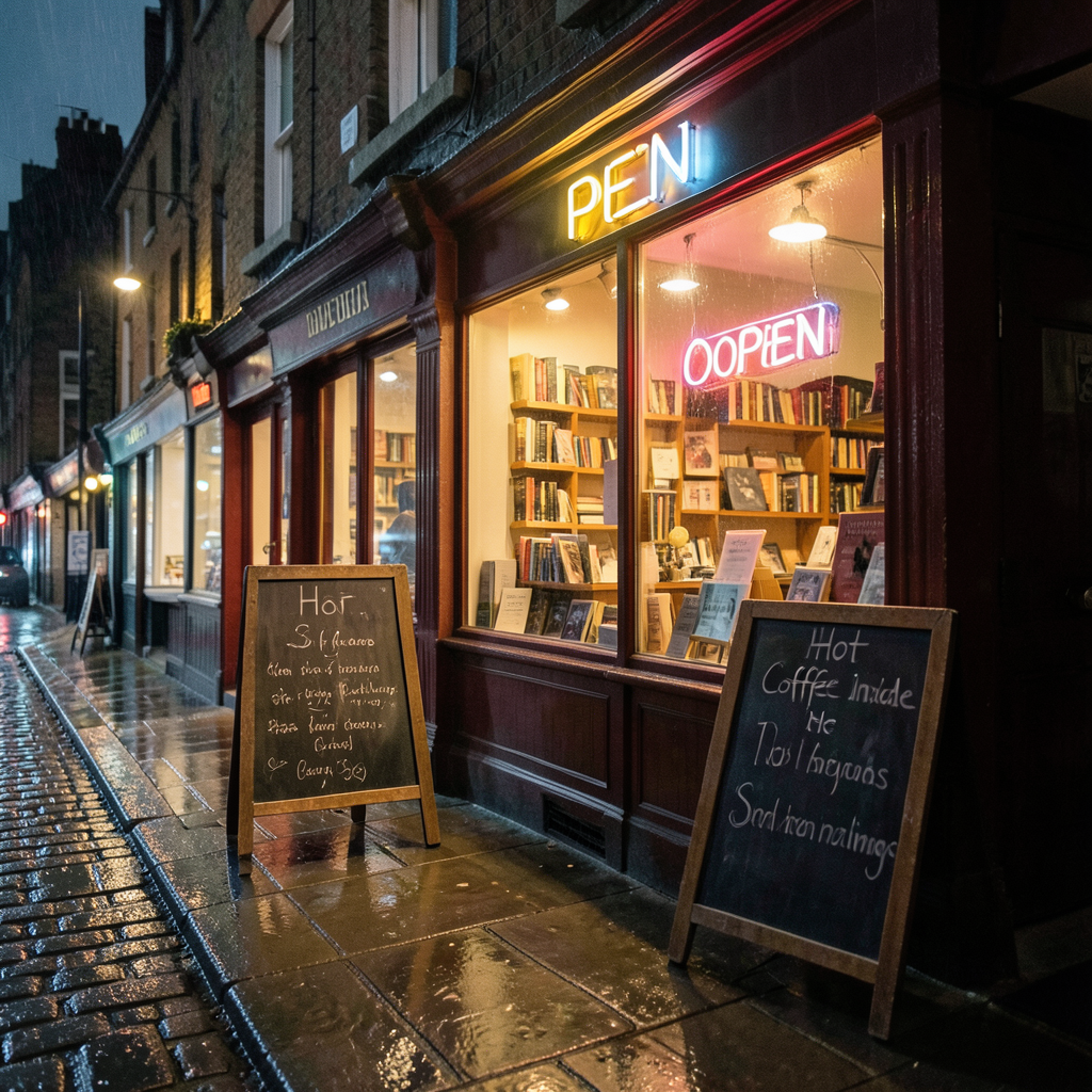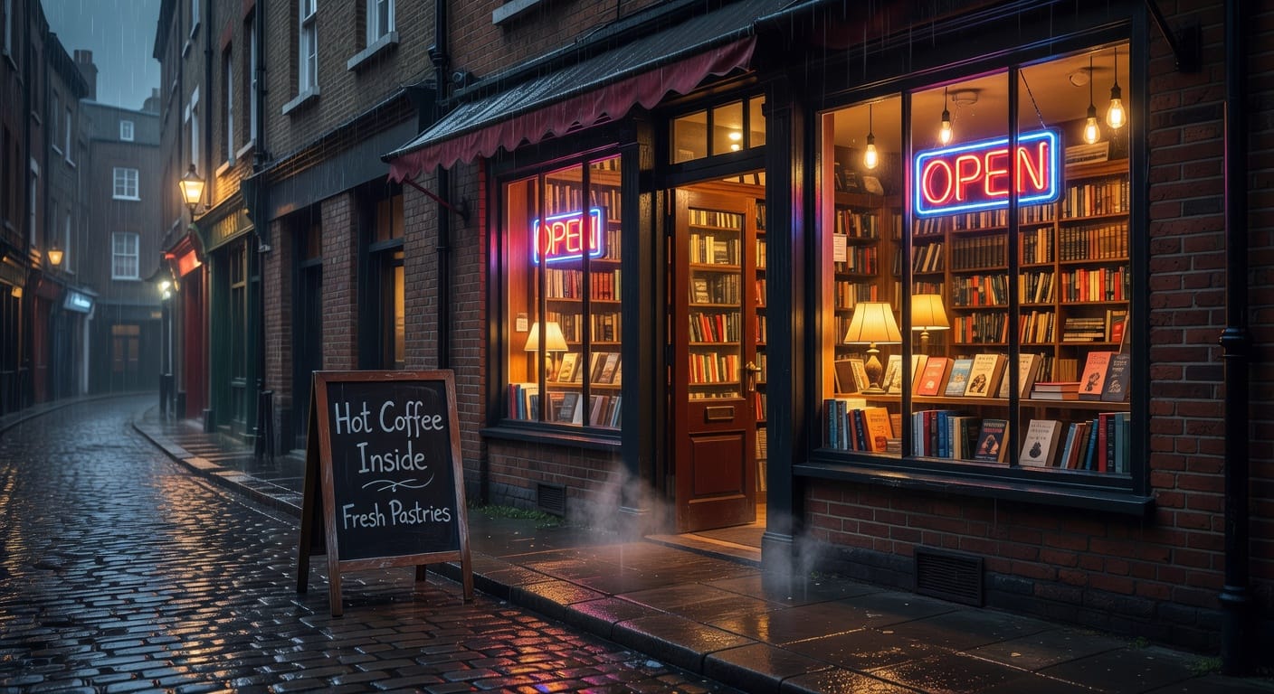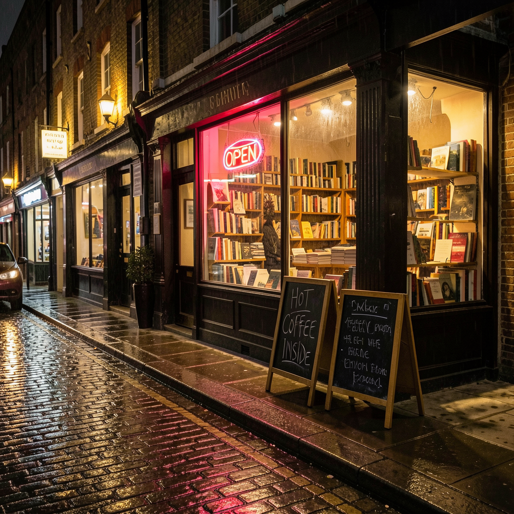 We first generate an image with a simple prompt: "A cozy bookshop on a rainy London street at night, a neon 'OPEN' sign glowing in the window, chalkboard menu on the sidewalk reading 'Hot Coffee Inside', warm light spilling onto wet cobblestones"