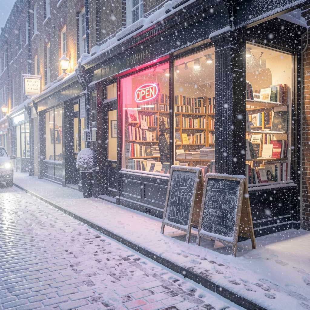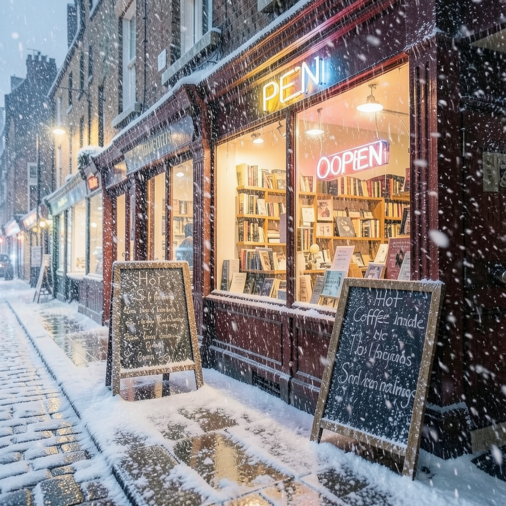 The image edit is pretty astonishing. The scene structure held up completely (even the messed up text). Same bookshop, same composition, but the whole atmosphere shifted. Snow piling up on the chalkboard edges and windowsill, wet pavement turned to slushy cobblestone. The falling snow even has depth to it, larger flakes up front, finer ones in the back. Pretty amazing result for such a small model...