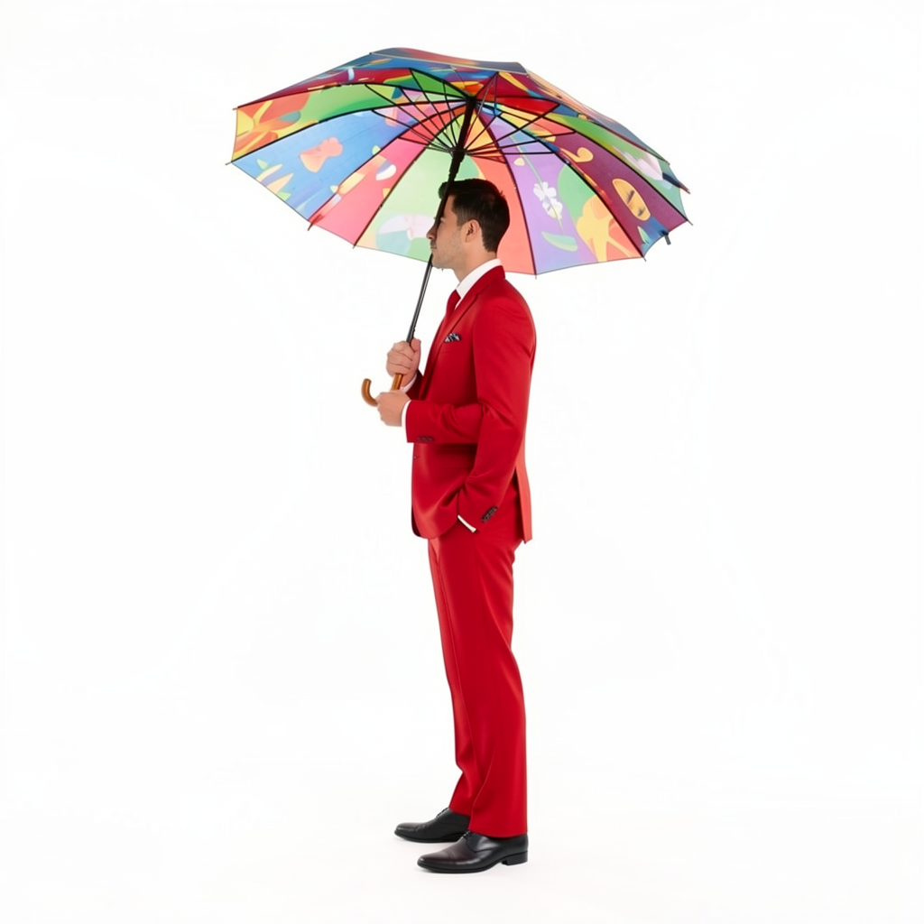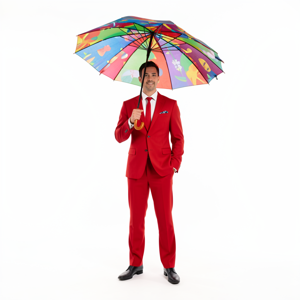 We asked FLUX.2 Klein 9B to generate a man in a red suit with a funky umbrella against a white background, from both the front and the side, to use as references for Kling. This is what we got.