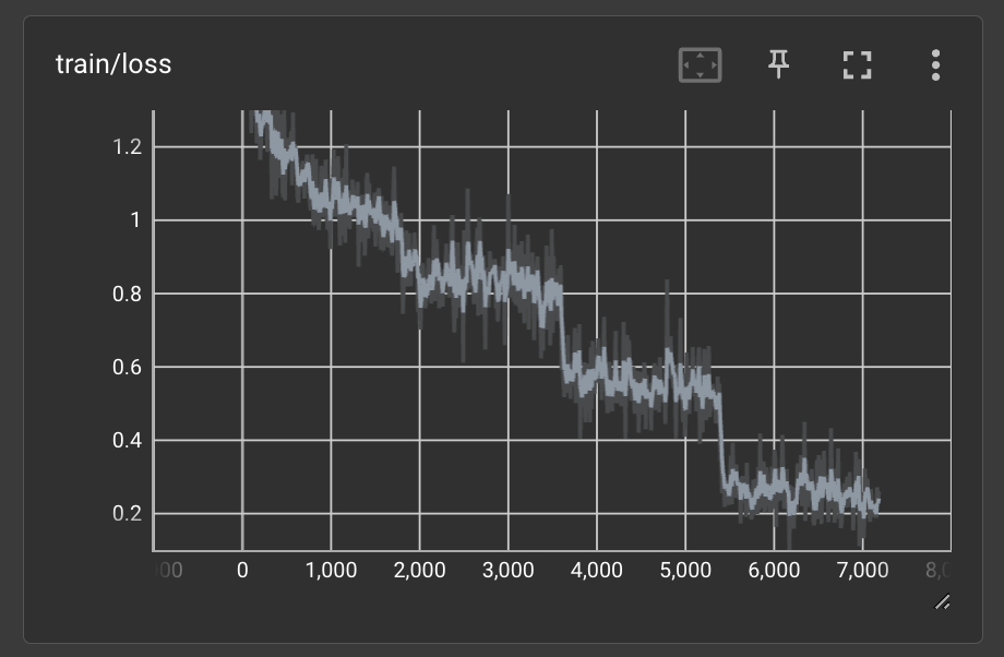 This code will run on a Macbook Pro with an M1 chip at ~4.5 sec/iteration, meaning it is seeing one batch of data every 4.5 seconds. Our training batch size was 16 above, meaning we are seeing just under 4 images a second. If you remember our dataset size above, it was 28,709 images. If we see 4 per second at 60 seconds in a minute and 60 minutes in an hour that is 28709/4/60/60 ~= 2hrs to see all the training data one time. We set num_train_epochs to 4, meaning this full train will take ~8 hours to complete.