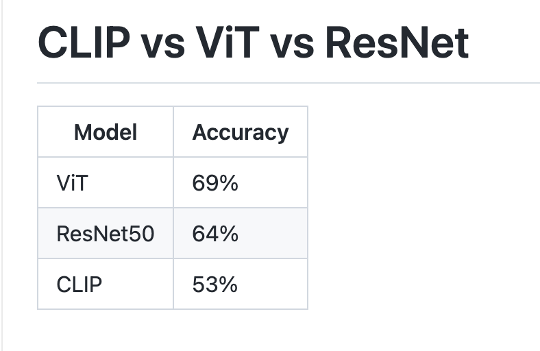 Before flushing out this tutorial, I benchmarked Vision Transformers vs a ResNet50 and Zero-shot CLIP to see which performed best.