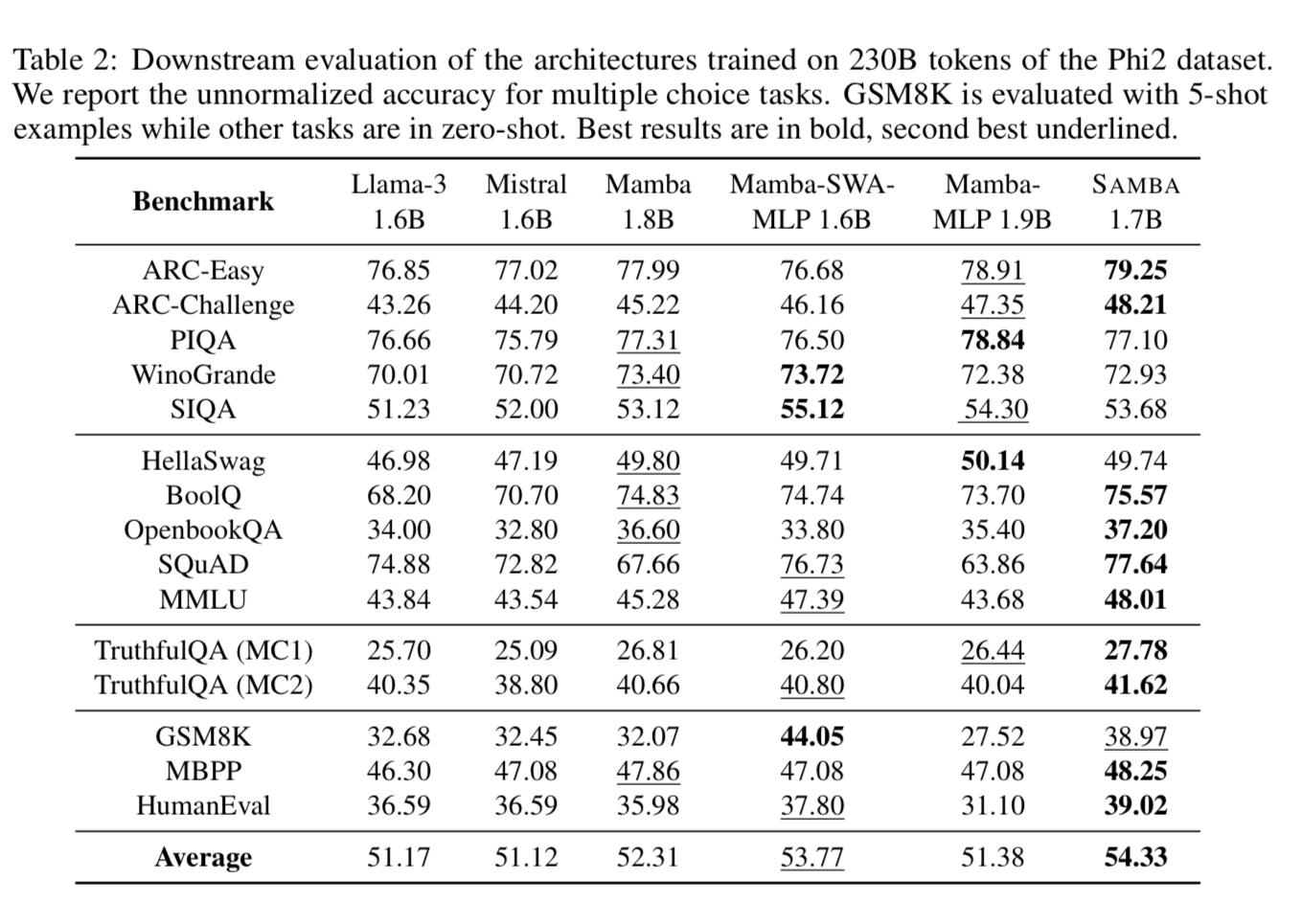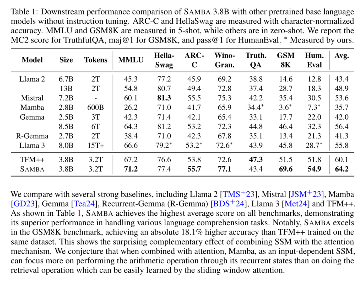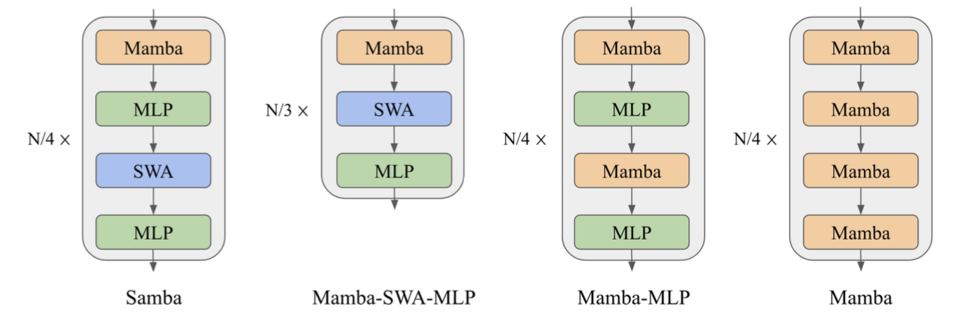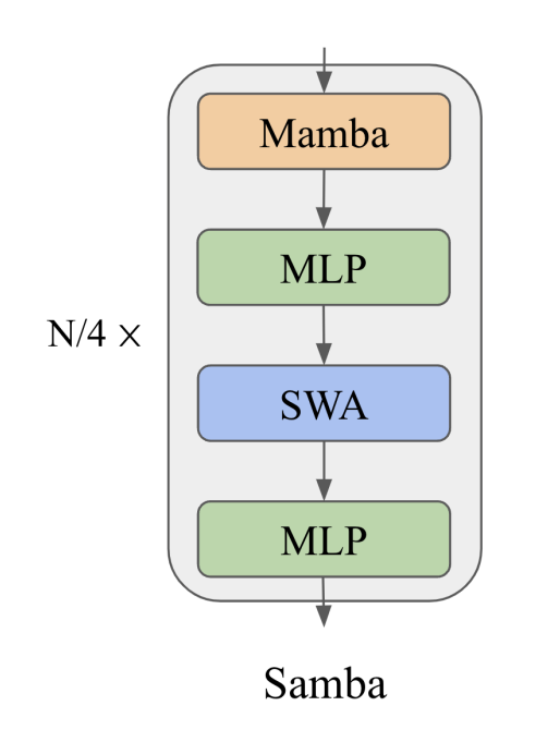 Samba fixes these issues by combining Mamba layers with Sliding Window Attention (SWA) and Multilayer Perceptions (MLP) to create a model with hybrid of techniques.