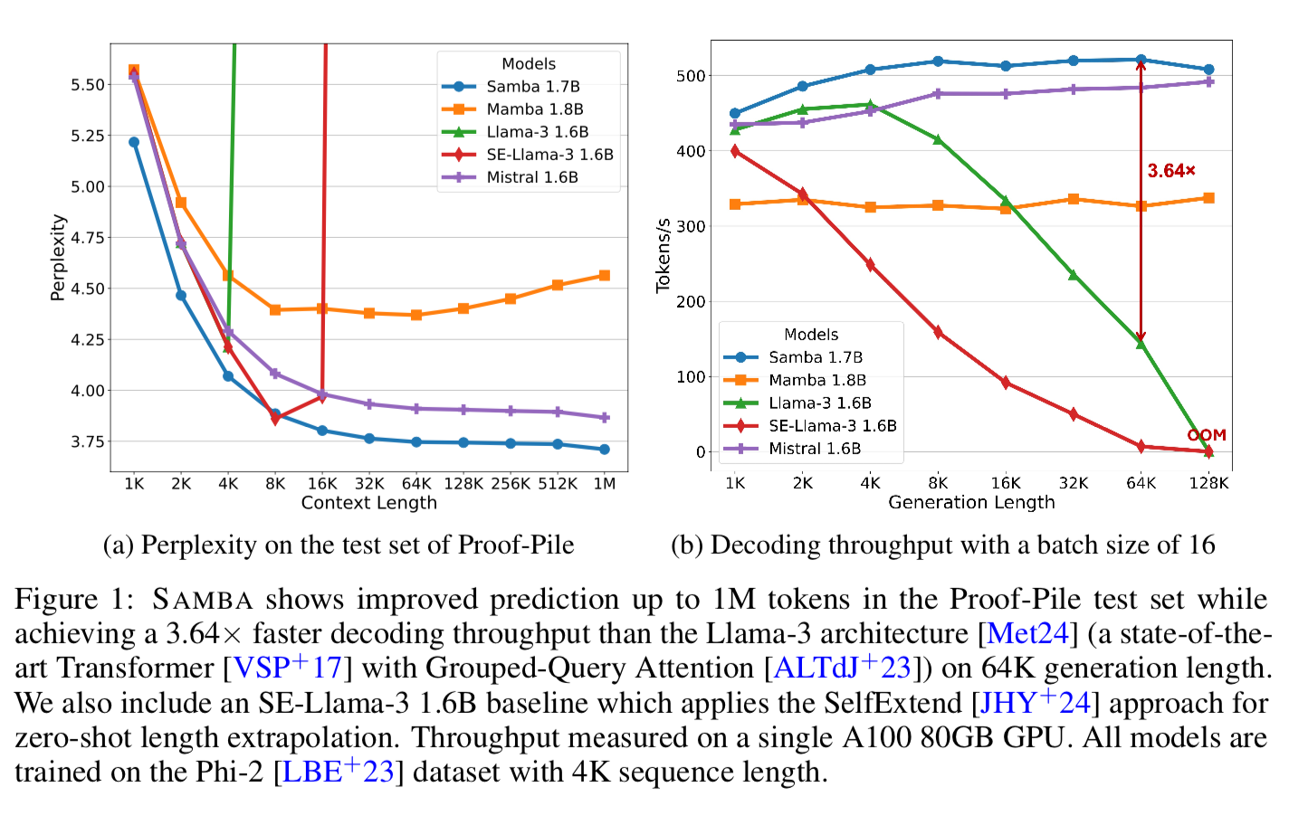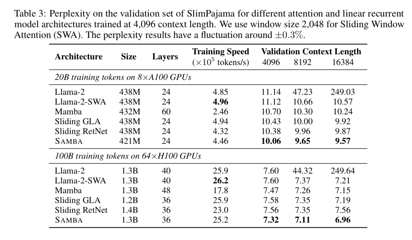 You can see that SAMBA is competitive in training speed, while winning on perplexity at context lengths of 4096, 8192, 16384.