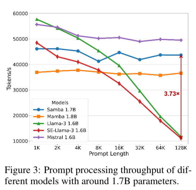 SAMBA has stable throughput compared to models with attention. Youāll notice Mistral has higher throughput, but thatās because it just uses SWA.