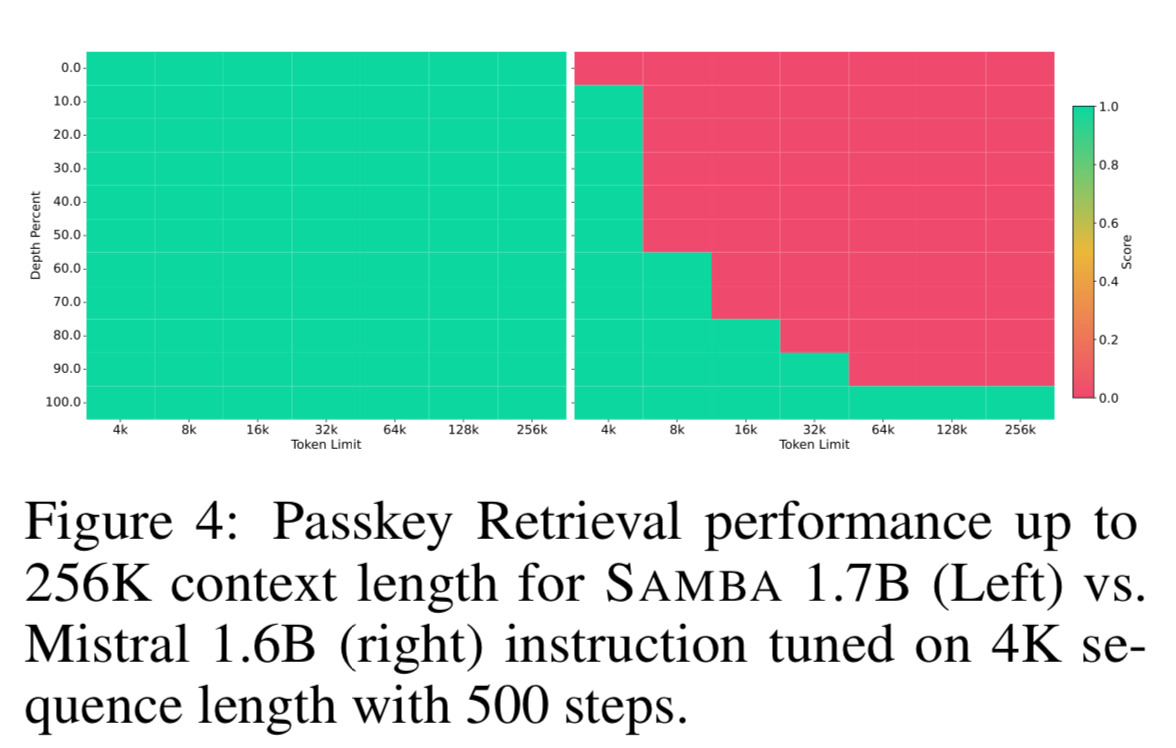 That being said, SAMBA outperforms Mistral on Passkey Retrieval up to 256k context length.