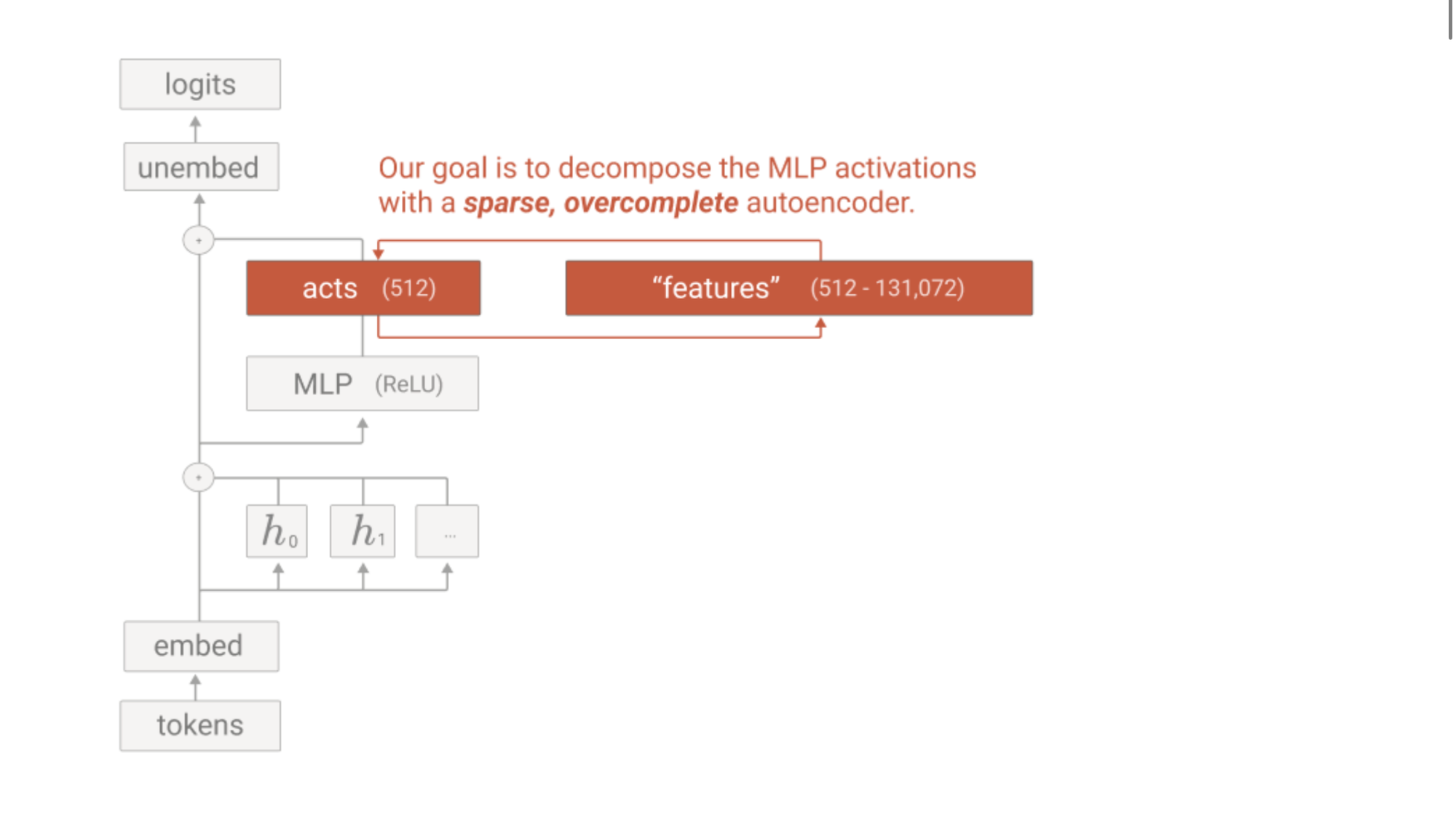 The goal is that a very small fraction of features will have nonzero activations, so that we can feed in tokens and see which model activations are “explained” by a small set of active features.