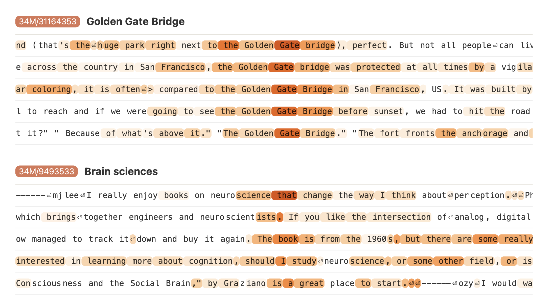 They take a feature and rank pieces of text based on how strongly the piece of text activates the feature. The highlight colors indicate activation strength at each token (white: no activation, orange: strongest activation).