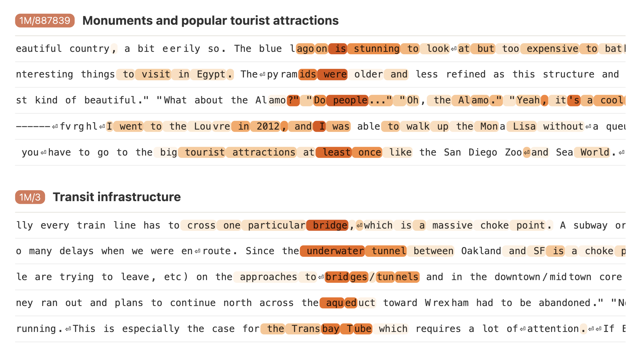 In the 1M training run, we also find a feature that strongly activates for various kinds of transit infrastructure 1M/3 including trains, ferries, tunnels, bridges, and even wormholes!