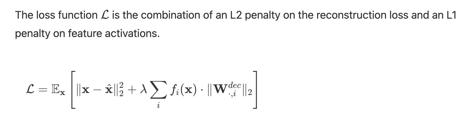 The model is trained to minimize a combination of (1) reconstruction error and (2) an L1 regularization penalty on the feature activations, which incentivizes sparsity.